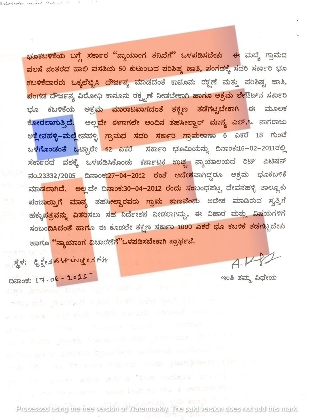 ಅಕ್ಲೇನಹಳ್ಳಿ ಮತ್ತು ಮಲ್ಲೇನಹಳ್ಳಿಯಲ್ಲಿನ ಪರಿಶಿಷ್ಟ ಜಾತಿ ಮತ್ತು ಪರಿಶಿಷ್ಟ ಪಂಗಡದ ನಿರಾಶ್ರಿತರ ಕ್ಷೇಮಾಭಿವೃದ್ಧಿ ಸಂಘವು ಮನವಿ ಸಲ್ಲಿಸಿತ್ತು. ಸುಮಾರು 1,000 ಎಕರೆ ಸರ್ಕಾರಿ ಜಮೀನಿನ ಬಗ್ಗೆ ಮನವಿಯಲ್ಲಿ ವಿವರಿಸಿತ್ತು.