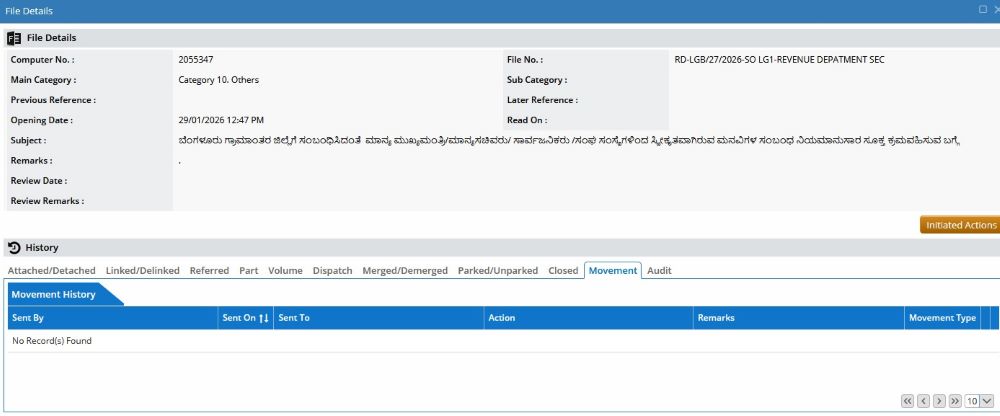 ಈ ದೂರಿಗೆ ಸಂಬಂಧಿಸಿದಂತೆ ಕ್ರಮ ಕೈಗೊಳ್ಳಲು ಕಂದಾಯ ಇಲಾಖೆಯಲ್ಲಿ  ಕಡತ (RD-LGB/27/2026 COMPUTER NUMBER 2055347) ತೆರೆದಿದೆ. ಸದ್ಯ ಈ ಕಡತವು ಅಧಿಕಾರಿಗಳ ಮಟ್ಟದಲ್ಲಿ ಚಲನವಲನದಲ್ಲಿರುವುದು ಗೊತ್ತಾಗಿದೆ.