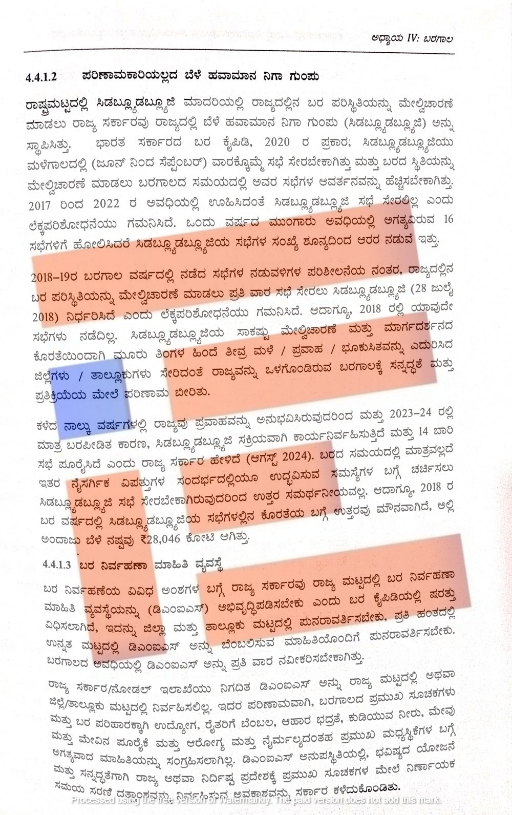 ಕಳೆದ ನಾಲ್ಕು ವರ್ಷಗಳಲ್ಲಿ ರಾಜ್ಯವು ಪ್ರವಾಹವನ್ನು ಅನುಭವಿಸಿದೆ. ಮತ್ತು 2023-24ರಲ್ಲಿ ಮಾತ್ರ ಬರಪೀಡಿತವಾಗಿತ್ತು. ಹೀಗಾಗಿ ಸಿಡಬ್ಲ್ಯೂಡಬ್ಲ್ಯೂಜಿ ಸಕ್ರೀಯವಾಗಿ ಕಾರ್ಯನಿರ್ವಹಿಸುತ್ತಿದೆ. ಮತ್ತು 14 ಬಾರಿ ಸಭೆಗಳನ್ನು ನಡೆಸಿದೆ ಎಂದು ರಾಜ್ಯ ಸರ್ಕಾರವು 2024ರ ಆಗಸ್ಟ್‌ನಲ್ಲಿ ಹೇಳಿದೆ. ಬರದ ಸಮಯದಲ್ಲಿ ಮಾತ್ರವಲ್ಲದೇ ಇತರೆ ನೈಸರ್ಗಿಕ ವಿಪತ್ತುಗಳ ಸಂದರ್ಭದಲ್ಲಿಯೂ ಉದ್ಭವಿಸುವ ಸಮಸ್ಯೆಗಳ ಬಗ್ಗೆ ಚರ್ಚಿಸಲು ಸಿಡಬ್ಲ್ಯೂಡಬ್ಲ್ಯೂಜಿ ಸಭೆ ಸೇರಬೇಕು. ಹೀಗಾಗಿ ರಾಜ್ಯ ಸರ್ಕಾರವು 2024ರ ಆಗಸ್ಟ್‌ನಲ್ಲಿ ನೀಡಿರುವ ಉತ್ತರವು ಸಮರ್ಥನೀಯವಾಗಿಲ್ಲ ಎಂದು ಸಿಎಜಿಯು ಹೇಳಿದೆ.