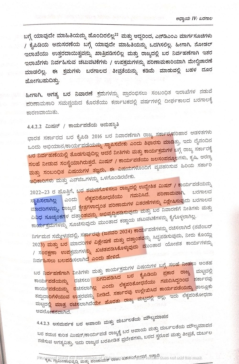 2022-23ರ ಹೊತ್ತಿಗೆ ಬರ ಶಮನಗೊಳಿಸಲು ರಾಜ್ಯದಲ್ಲಿ ಉದ್ದೇಶಿತ ಮಿಷನ್, ಕಾರ್ಯಪಡೆಯನ್ನು ಸ್ಥಾಪಿಸಿರಲಿಲ್ಲ ಎಂಬುದನ್ನು ಲೆಕ್ಕ ಪರಿಶೋಧನೆಯು ಗಮನಿಸಿದೆ. ಹೀಗಾಗಿ ಬರಗಾಲದ ಮಾದರಿಗಳನ್ನು, ರಾಜ್ಯದ ಕ್ಷೇತ್ರಗಳಾದ್ಯಂತ ಪರಿಣಾಮಗಳ ವಿತರಣೆ ವಿಶ್ಲೇಷಣೆ ಮಾಡುವುದು, ಬರಗಾಲದ ವಿವಿಧ ಸೂಚ್ಯಂಕಗಳ ದತ್ತಾಂಶವನ್ನು ಅಭಿವೃದ್ಧಿ ಪಡಿಸುವುದು ಮತ್ತು ಬರ ನಿರ್ವಹಣೆಗಾಗಿ ನೀತಿಗಳು, ಕಾರ್ಯಕ್ರಮಗಳನ್ನು ಸೂಚಿಸುವುದಂತಹ ಕಡ್ಡಾಯ ಚಟುವಟಿಕೆಗಳನ್ನೇ ನಡೆಸಲಾಗಲಿಲ್ಲ.