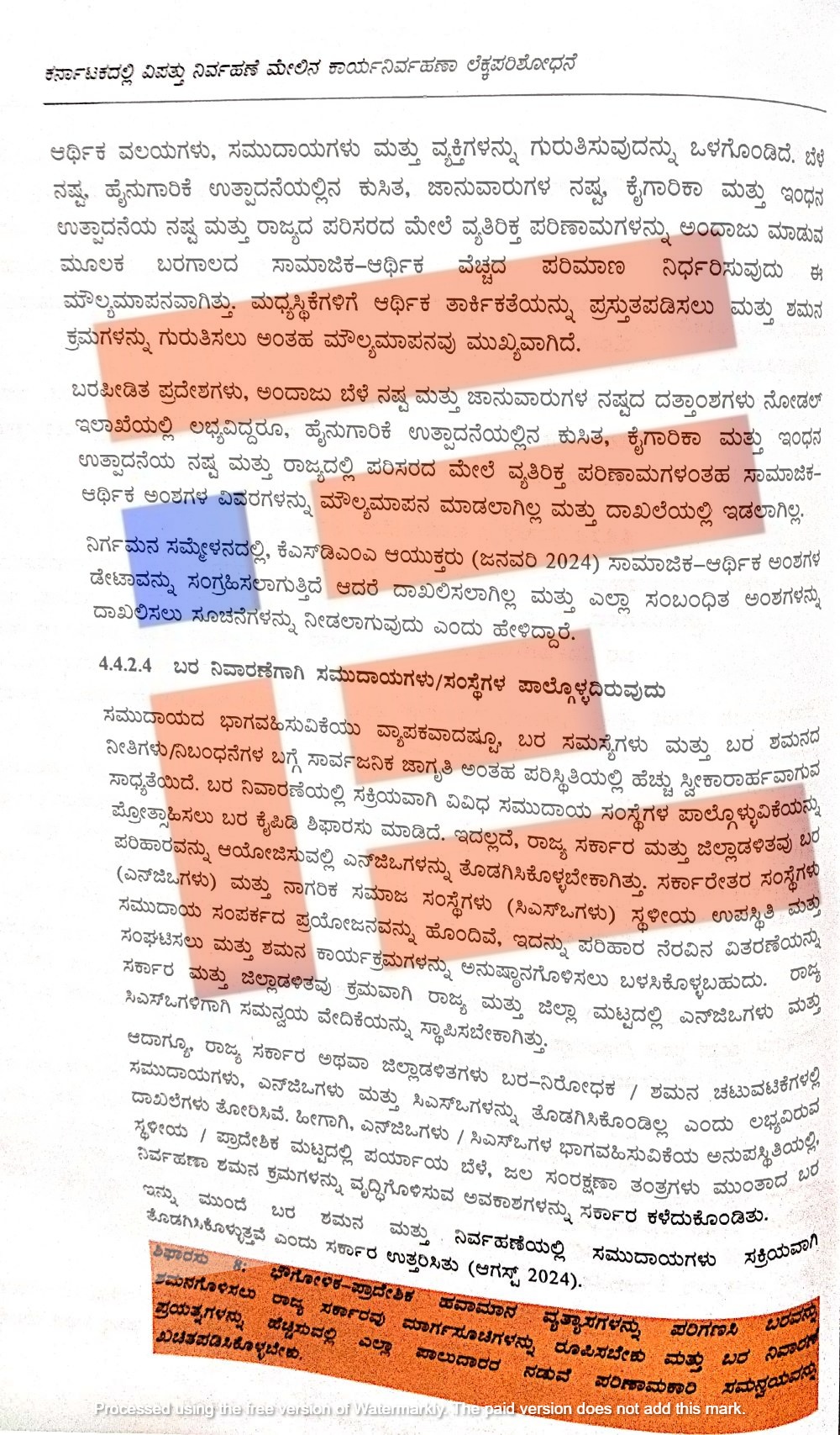 ಬರ ಪೀಡಿತ ಪ್ರದೇಶಗಳು, ಅಂದಾಜು ಬೆಳೆ ನಷ್ಟ, ಜಾನುವಾರುಗಳ ನಷ್ಟದ ದತ್ತಾಂಶಗಳು ನೋಡಲ್ ಇಲಾಖೆಯಲ್ಲಿ ಲಭ್ಯವಿವೆ. ಹೈನುಗಾರಿಕೆ ಉತ್ಪಾದನೆಯಲ್ಲಿನ ಕುಸಿತ, ಕೈಗಾರಿಕೆ ಮತ್ತು ಇಂಧನ ಉತ್ಪಾದನೆಯ ನಷ್ಟ ಮತ್ತು ರಾಜ್ಯದಲ್ಲಿ ಪರಿಸರದ ಮೇಲೆ  ವ್ಯತಿರಿಕ್ತ ಪರಿಣಾಮಗಳಂತಹ  ಸಾಮಾಜಿಕ, ಆರ್ಥಿಕ ಅಂಶಗಳ ವಿವರಗಳನ್ನು ಮೌಲ್ಯಮಾಪನ ಮಾಡಿಲ್ಲ ಮತ್ತು ಅದನ್ನು ದಾಖಲೆ ರೂಪದಲ್ಲಿಯೂ ಇಟ್ಟಿಲ್ಲ. ಬರ ನಿರೋಧಕ, ಬರ ಶಮನ ಚಟುವಟಿಕೆಗಳಲ್ಲಿ ಸಮುದಾಯಗಳು, ಎನ್‌ಜಿಒಗಳು, ಸಿಎಸ್‌ಒಗಳನ್ನು ರಾಜ್ಯ ಸರ್ಕಾರವು ತೊಡಗಿಸಿಕೊಂಡಿಲ್ಲ ಎಂದು ಸಿಎಜಿ ವರದಿಯಲ್ಲಿ ವಿವರಿಸಲಾಗಿದೆ.