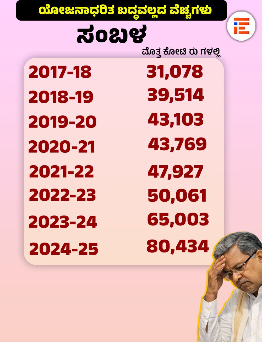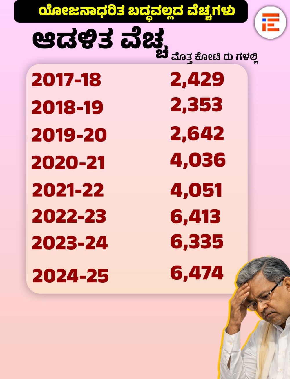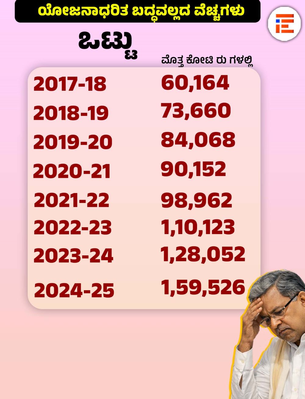 ಒಟ್ಟಾರೆ ಸಂಬಳ, ಪಿಂಚಣಿ, ಬಡ್ಡಿ ಪಾತಿ ಮತ್ತು ಆಡಳಿತ ವೆಚ್ಚಕ್ಕೆ ಸಂಬಂಧಿಸಿದಂತೆ 2017-18ರಲ್ಲಿ 60,164 ಕೋಟಿ, 2018-19ರಲ್ಲಿ 73,660 ಕೋಟಿ, 2019-20ರಲ್ಲಿ 84,068 ಕೋಟಿ, 2020-21ರಲ್ಲಿ 90,152 ಕೋಟಿ, 2021-22ರಲ್ಲಿ 98,962 ಕೋಟಿ, 2022-23ರಲ್ಲಿ 1,10,123 ಕೋಟಿ, 2023-24ರಲ್ಲಿ 1,28,052 ಕೋಟಿ, 2024-25ರಲ್ಲಿ 1,59,526 ಕೋಟಿ ರು ವೆಚ್ಚ ಮಾಡಲಾಗಿತ್ತು.