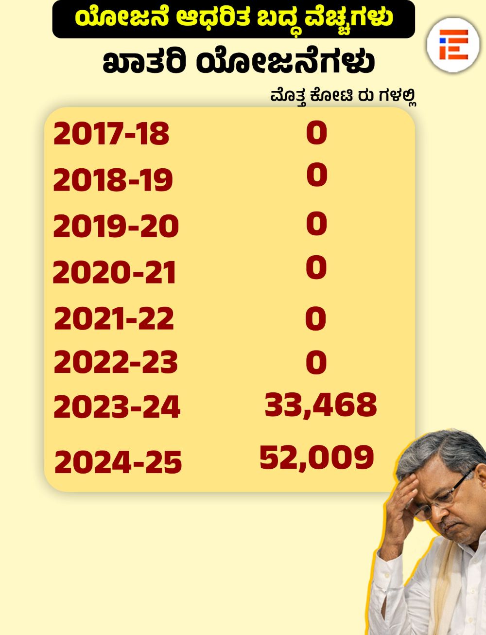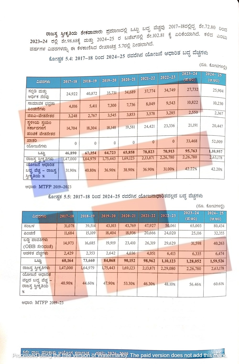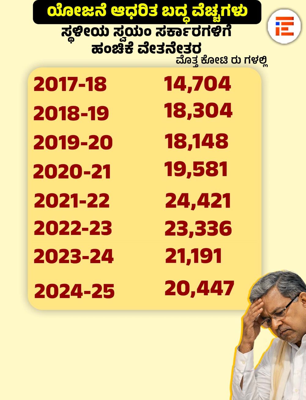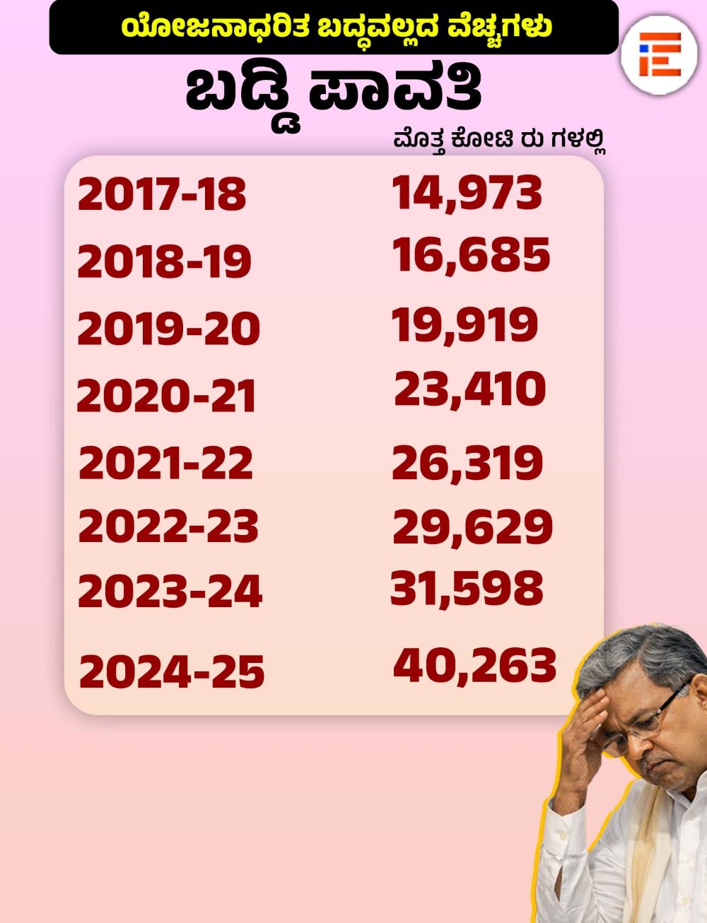 ಒಟ್ಟಾರೆ ಸಂಬಳ, ಪಿಂಚಣಿ, ಬಡ್ಡಿ ಪಾತಿ ಮತ್ತು ಆಡಳಿತ ವೆಚ್ಚಕ್ಕೆ ಸಂಬಂಧಿಸಿದಂತೆ 2017-18ರಲ್ಲಿ 60,164 ಕೋಟಿ, 2018-19ರಲ್ಲಿ 73,660 ಕೋಟಿ, 2019-20ರಲ್ಲಿ 84,068 ಕೋಟಿ, 2020-21ರಲ್ಲಿ 90,152 ಕೋಟಿ, 2021-22ರಲ್ಲಿ 98,962 ಕೋಟಿ, 2022-23ರಲ್ಲಿ 1,10,123 ಕೋಟಿ, 2023-24ರಲ್ಲಿ 1,28,052 ಕೋಟಿ, 2024-25ರಲ್ಲಿ 1,59,526 ಕೋಟಿ ರು ವೆಚ್ಚ ಮಾಡಲಾಗಿತ್ತು.