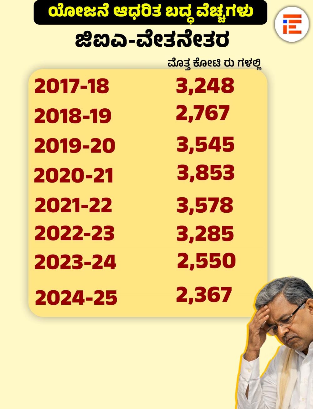 ಜಿಐಎ-ವೇತನೇತರ ವಿಭಾಗದಲ್ಲಿ 2017-18ರಲ್ಲಿ 3,248 ಕೋಟಿ, 2018-19ರಲ್ಲಿ 2,767 ಕೋಟಿ, 2019-20ರಲ್ಲಿ 3,545 ಕೋಟಿ, 2020-21ರಲ್ಲಿ 3,853 ಕೋಟಿ, 2021-22ರಲ್ಲಿ 3,578 ಕೋಟಿ, 2022-23ರಲ್ಲಿ 3,285 ಕೋಟಿ, 2023-24ರಲ್ಲಿ 2,550 ಕೋಟಿ, 2024-25ರಲ್ಲಿ 2,367 ಕೋಟಿ ರು ಇತ್ತು.