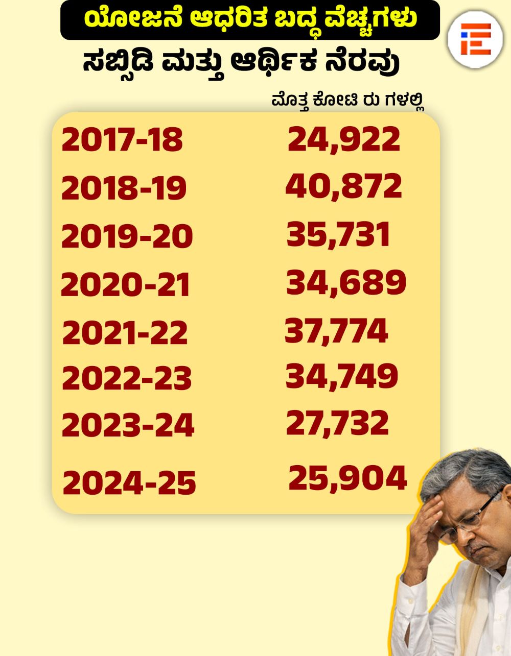 ಸಬ್ಸಿಡಿ ಮತ್ತು ಆರ್ಥಿಕ ನೆರವಿಗೆ 2017-18ರಲ್ಲಿ 24,922 ಕೋಟಿ ರುಗಳನ್ನು ಯೋಜನೆ ಆಧರಿತ ಬದ್ಧತಾ ವೆಚ್ಚದಲ್ಲಿ ಸೇರಿಸಲಾಗಿತ್ತು. 2018-19ರಲ್ಲಿ ಇದು 40,872 ಕೋಟಿ, 2019-20ರಲ್ಲಿ 35,731 ಕೋಟಿ, 2020-21ರಲ್ಲಿ 34,689 ಕೋಟಿ, 2022-22ರಲ್ಲಿ 34,749 ಕೋಟಿ, 2023-24ರಲ್ಲಿ 27,732 ಕೋಟಿ, 2024-25ರಲ್ಲಿ 25,904 ಕೋಟಿ ರು ಯೋಜನೆ ಆಧರಿತ ಬದ್ಧತಾ ವೆಚ್ಚವಾಗಿತ್ತು.