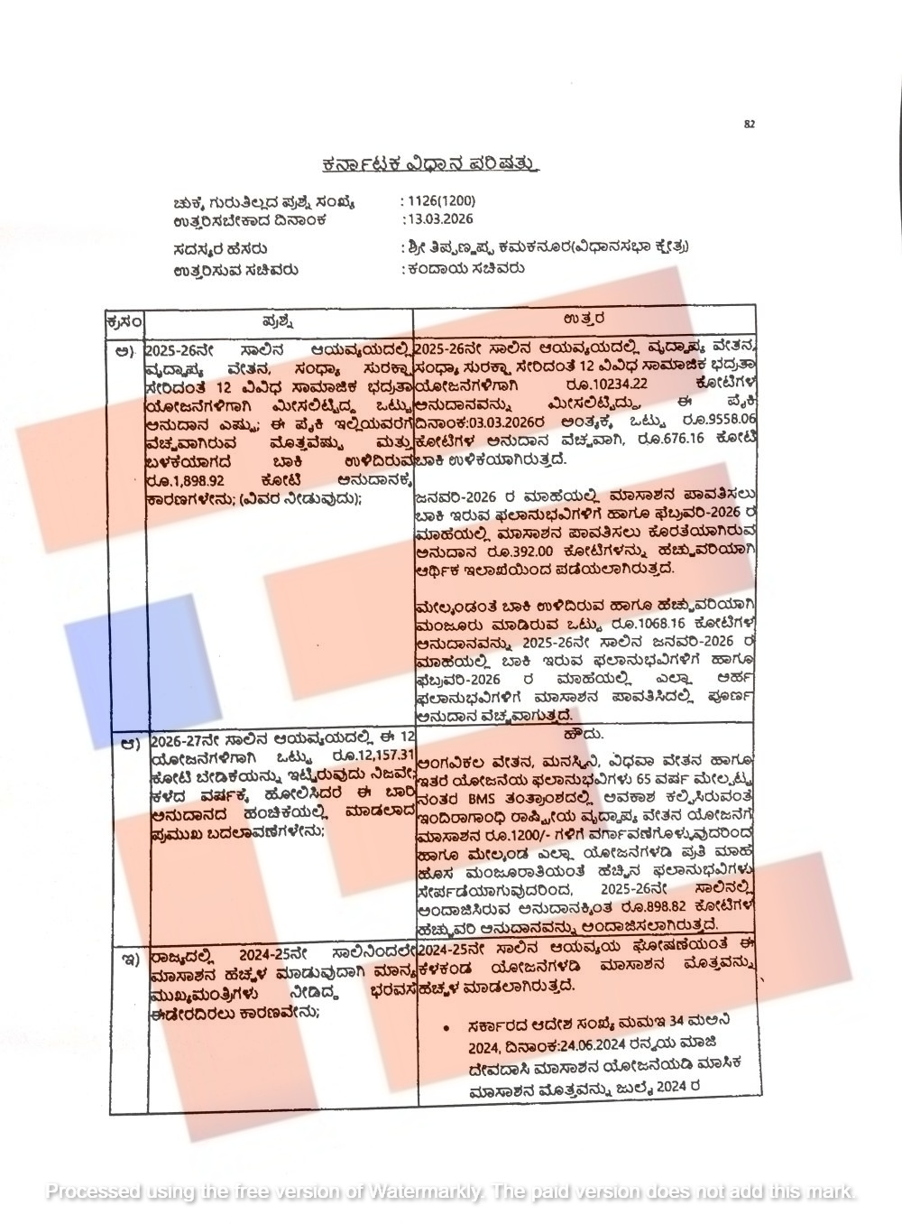 ವೃದ್ಧಾಪ್ಯ ವೇತನಕ್ಕೆ 3,015.81 ಕೋಟಿ, ಸಂಧ್ಯಾ ಸುರಕ್ಷಾ ಯೋಜನೆಗೆ 4,990.41 ಕೋಟಿ, ವಿಧವಾ ವೇತನಕ್ಕೆ 1,976.66 ಕೋಟಿ, ಅಂಗವಿಕಲ ವೇತನಕ್ಕೆ 1759.73 ಕೋಟಿ, ಮೈತ್ರಿ ಯೋಜನೆಗೆ 4.60 ಕೋಟಿ, ಮನಸ್ವಿನಿ ಯೋಜನೆಗೆ 154.78 ಕೋಟಿ, ಆಸಿಡ್ ದಾಳಿಗೊಳಗಾದ ಮಹಿಳೆಯರಿಗೆ ಸಹಾಯ ಧನಕ್ಕೆಂದು 0.92 ಕೋಟಿ,