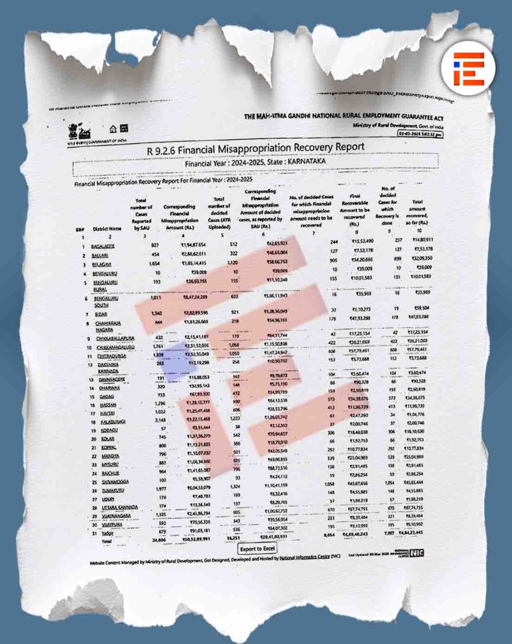 ಬಾಗಲಕೋಟೆಯಲ್ಲಿ 2,36,10,159 ರು., ಬಳ್ಳಾರಿಯಲ್ಲಿ 1,06,28,022 ರು., ಬೆಳಗಾವಿಯಲ್ಲಿ 2,36,74,743 ರು., ಬೆಂಗಳೂರಿನಲ್ಲಿ 2,79,074, ಬೆಂಗಳೂರು ಗ್ರಾಮಾಂತರದಲ್ಲಿ 8,67,192 ರು., ಬೀದರ್ನಲ್ಲಿ 3,17,30.017 ರು., ಚಾಮರಾಜನಗರದಲ್ಲಿ 3,40,67,560 ರು., ಚಿಕ್ಕಬಳ್ಳಾಪುರದಲ್ಲಿ 3,32,73,359 ರು., ಚಿಕ್ಕಮಗಳೂರಿನಲ್ಲಿ 1,54,25,875 ರು., ಚಿತ್ರದುರ್ಗದಲ್ಲಿ 66,17,841 ರು., ದಕ್ಷಿಣ ಕನ್ನಡದಲ್ಲಿ 25,36,867 ರು ಹಣ ದುರುಪಯೋಗವಾಗಿತ್ತು.