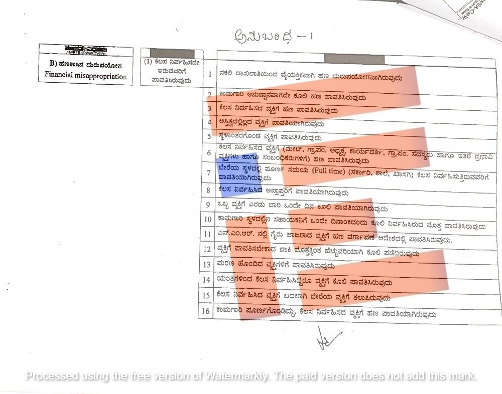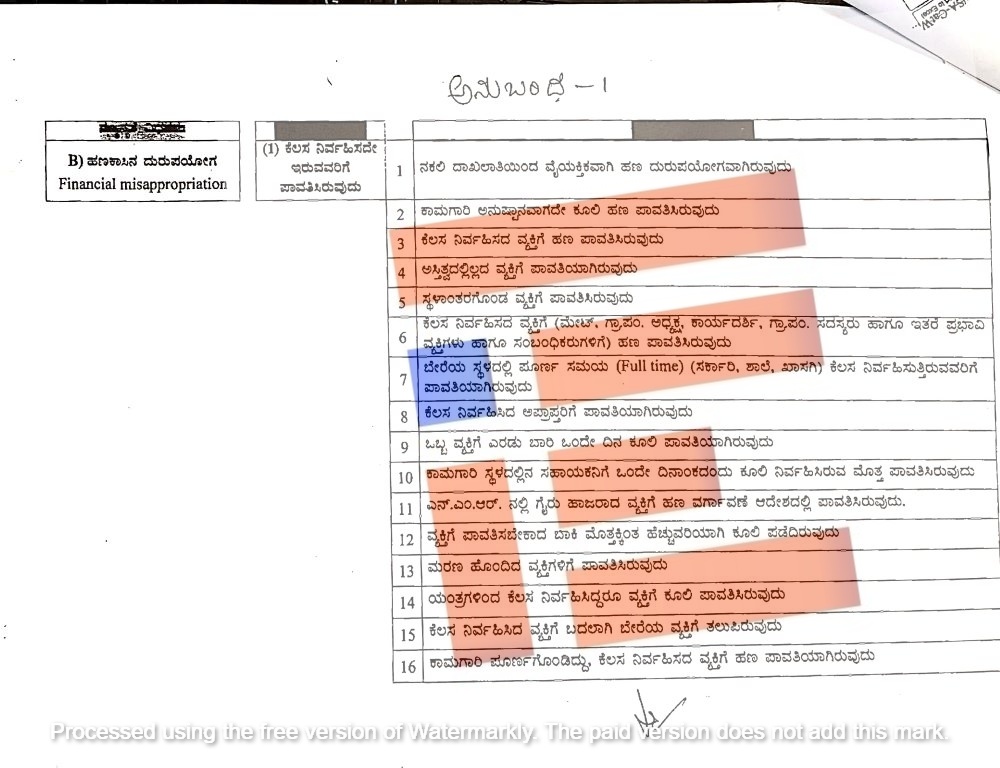 ಕೆಲಸವನ್ನು ನಿರ್ವಹಿಸಿದ್ದಾರೆ ಎಂದು ಹೇಳಲಾಗಿದ್ದ ಹಲವು ಅಪ್ರಾಪ್ತರಾಗಿದ್ದರು. ಆದರೂ ಅವರಿಗೆ ಹಣ ಪಾವತಿಸಲಾಗಿದೆ. ಒಬ್ಬ ವ್ಯಕ್ತಿಗೆ ಎರಡು ಬಾರಿ ಒಂದೇ ದಿನ ಕೂಲಿ ಪಾವತಿಯಾಗಿದೆ. ಕಾಮಗಾರಿ ಸ್ಥಳದಲ್ಲಿನ ಸಹಾಯಕನಿಗೆ ಒಂದೇ ದಿನಾಂಕದಂದು ಕೂಲಿ ನಿರ್ವಹಿಸಿರುವ ಮೊತ್ತ ಪಾವತಿಸಿದೆ. ಎನ್ಎಂಆರ್ನಲ್ಲಿ ಗೈರು ಹಾಜರಾದ ವ್ಯಕ್ತಿಗೆ ಹಣ ವರ್ಗಾವಣೆ ಮಾಡಲಾಗಿದೆ. ವ್ಯಕ್ತಿಗೆ ಪಾವತಿಸಬೇಕಾದ ಬಾಕಿ ಮೊತ್ತಕ್ಕಿಂತ ಹೆಚ್ಚುವರಿಯಾಗಿ ಕೂಲಿ ಪಡೆದಿರುವುದು, ಮರಣ ಹೊಂದಿದ ವ್ಯಕ್ತಿಗಳಿಗೆ ಹಣ ಪಾವತಿಸಿರುವ ಪ್ರಕರಣಗಳನ್ನೂ ಇಲಾಖೆಯು ಪತ್ತೆ ಹಚ್ಚಿರುವುದು ಗೊತ್ತಾಗಿದೆ.