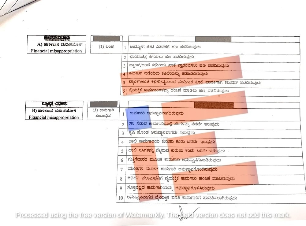 ಉದ್ಯೋಗ ಚೀಟಿ ವಿತರಣೆಗೆ ಲಂಚವನ್ನು ಪಡೆದಿರುವುದನ್ನು ತಪಾಸಣೆ ಸಂದರ್ಭದಲ್ಲಿ ಬೆಳಕಿಗೆ ಬಂದಿದೆ. ಉದ್ಯೋಗ ಚೀಟಿ ವಿತರಣೆ ಮಾತ್ರವಲ್ಲ, ಛಾಯಾಚಿತ್ರ ತೆಗೆಯಲು, ಬ್ಯಾಂಕ್, ಅಂಚೆ ಕಚೇರಿಯಲ್ಲಿ ಖಾತೆ ತೆರೆಯಲು, ಕಮಿಷನ್ ಪಡೆಯಲು ಕೂಲಿ ಹಣವನ್ನು ತಡೆಹಿಡಿದಿರುವುದು, ಬ್ಯಾಂಕ್, ಅಂಚೆ ಕಚೇರಿ, ವ್ಯವಹಾರ ವರದಿಗಾರರ ಕೂಲಿ ಪಾವತಿಗೂ ಕಮಿಷನ್ ಪಡೆಯಲಾಗಿದೆ. ವೈಯಕ್ತಿಕ ಕಾಮಗಾರಿಗಳನ್ನು ಹಂಚಿಕೆ ಮಾಡಲು ಹಣ ಪಡೆದಿರುವುದನ್ನೂ ಪತ್ತೆ ಹಚ್ಚಿರುವುದು ಉತ್ತರದಿಂದ ತಿಳಿದು ಬಂದಿದೆ.