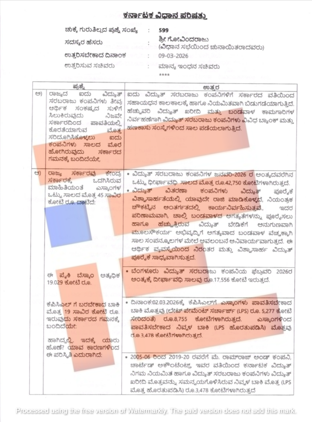 ಬೆಂಗಳೂರು ವಿದ್ಯುತ್ ಸರಬರಾಜು ಕಂಪನಿಯು ಫೆಬ್ರುವರಿ 2026ರ ಅಂತ್ಯಕ್ಕೆ 17,556 ಕೋಟಿ ರು ದೀರ್ಘಾವಧಿ ಸಾಲವನ್ನು ಹೊಂದಿದೆ. 2026ರ ಮಾರ್ಚ್ 2 ರ ಅಂತ್ಯಕ್ಕೆ ಕೆಪಿಸಿಎಲ್ ಗೆ ಎಸ್ಕಾಂಗಳು (ಲೇಟ್ ಪೇಮೆಂಟ್ ಸರ್ಚಾರ್ಜ್ (ಎಲ್ಪಿಎಸ್) 5,277 ಕೋಟಿ ರು ಸೇರಿ 8,755 ಕೋಟಿ ರು ಪಾವತಿಸಬೇಕಿದೆ. ಎಸ್ಕಾಂಗಳಿಂದ ಪಾವತಿಸಬೇಕಾದ ನಿವ್ವಳ ಬಾಕಿ (ಎಲ್ಪಿಎಸ್) ಹೊರತುಪಡಿಸಿ 3,478 ಕೋಟಿ ರು ಪಾವತಿಸಬೇಕಿದೆ ಎಂಬುದು ಉತ್ತರದಿಂದ ತಿಳಿದು ಬಂದಿದೆ.