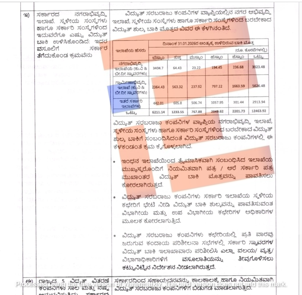 ನಗರಾಭಿವೃದ್ಧಿ ಇಲಾಖೆಯ ಕುಡಿಯುವ ನೀರು ಮತ್ತು ಬೀದಿ ಸ್ಥಾವರಗಳಿಂದ ಬೆಸ್ಕಾಂಗೆ 3,404.7 ಕೋಟಿ, ಸೆಸ್ಕ್ ಗೆ 64.43 ಕೋಟಿ, ಮೆಸ್ಕಾಂ ಗೆ 23.22 ಕೋಟಿ, ಹೆಸ್ಕಾಂಗೆ 194.45 ಕೋಟಿ, ಜೆಸ್ಕಾಂಗೆ 236.68 ಕೋಟಿ ಸೇರಿ ಒಟ್ಟಾರೆ 3,923.48 ಕೋಟಿ ರು ಬರಬೇಕಿದೆ. ಅದೇ ರೀತಿ ಗ್ರಾಮೀಣಾಭಿವೃದ್ಧಿ ಇಲಾಖೆಯ ಕುಡಿಯುವ ನೀರು ಮತ್ತು ಬೀದಿ ಸ್ಥಾವರಗಳಿಂದ ಬೆಸ್ಕಾಂಗೆ 2,364.43 ಕೋಟಿ, ಸೆಸ್ಕ್ಗೆ 563.32 ಕೋಟಿ, ಮೆಸ್ಕಾಂಗೆ 237.92 ಕೋಟಿ, ಹೆಸ್ಕಾಂಗೆ 797.22 ಕೋಟಿ, ಜೆಸ್ಕಾಂಗೆ 1,663.59 ಕೋಟಿ ಸೇರಿ ಒಟ್ಟಾರೆ 5,626.48 ಕೋಟಿ ರು ಬಾಕಿ ಬರಬೇಕಿದೆ ಎಂದು ವಿವರಿಸಿದೆ.