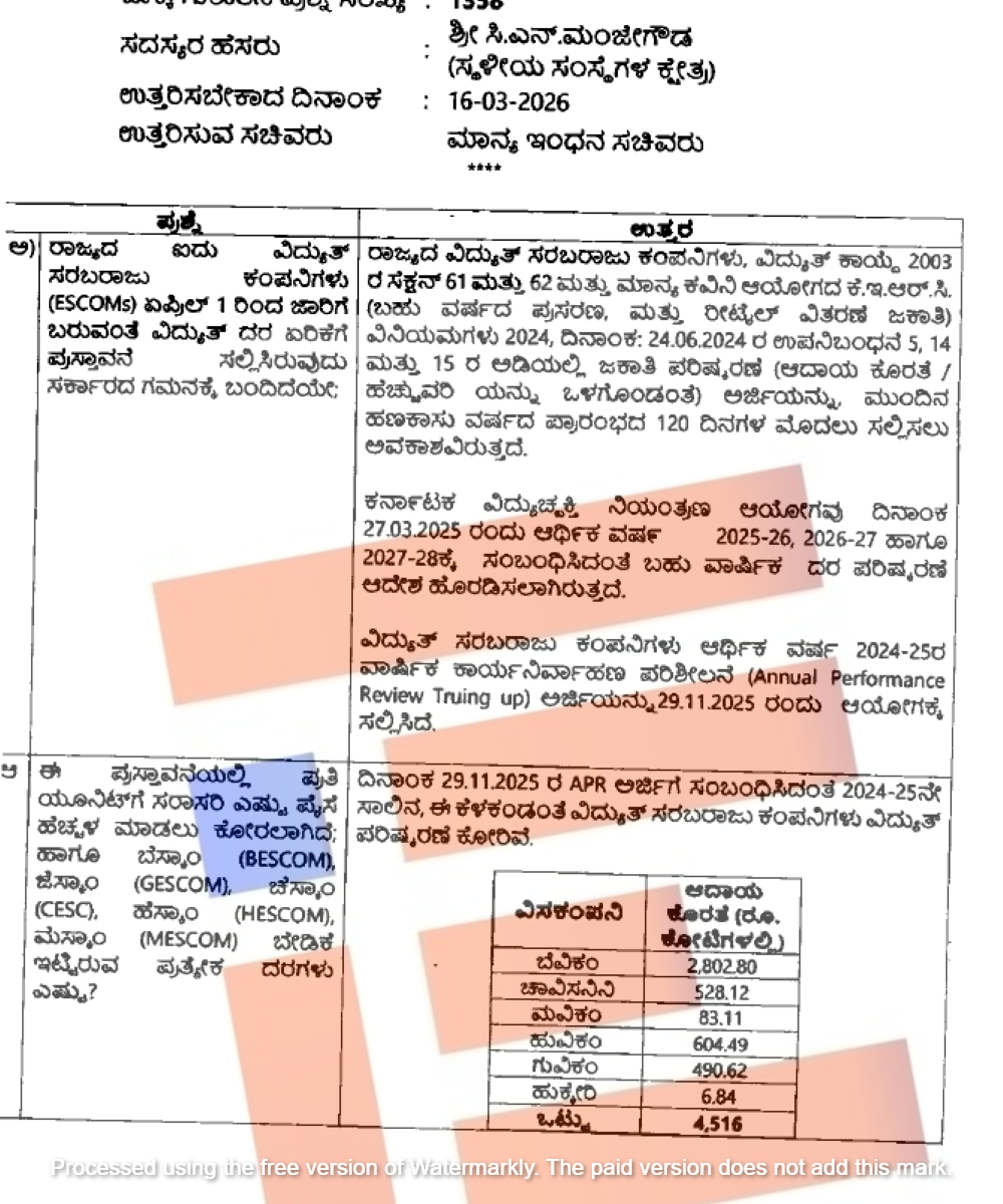 ಅಲ್ಲದೇ ಆಯೋಗವು 3,352 ಕೋಟಿ ರು.ಗಳ ಕಾರ್ಯಾಚರಣೆ ಮತ್ತು ನಿರ್ವಹಣೆ ವೆಚ್ಚವನ್ನು ನಿಗದಿಪಡಿಸಿದೆ. ಬೆಸ್ಕಾಂ 3,390 ಕೋಟಿ ರು. ಕಾರ್ಯಾಚರಣೆ ಮತ್ತು ನಿರ್ವಹಣಾ ವೆಚ್ಚವನ್ನು ಮಾಡಿದೆ. ಇದರಿಂದಾಗಿ 38 ಕೋಟಿಗಳಷ್ಟು ಕಾರ್ಯಚರಣೆ ಮತ್ತು ನಿರ್ವಹಣೆ ವೆಚ್ಚವು ಅಧಿಕವಾಗಿರುವುದು ಉತ್ತರದಿಂದ ತಿಳಿದು ಬಂದಿದೆ.