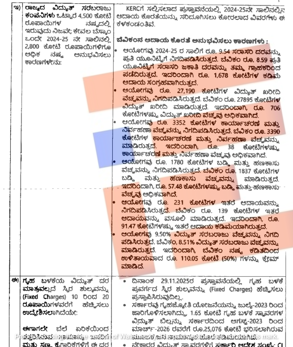 ಕರ್ನಾಟಕ ವಿದ್ಯುಚ್ಛಕ್ತಿ ನಿಯಂತ್ರಣ ಆಯೋಗವು 2024-25ನೇ ಸಾಲಿಗೆ ಪ್ರತಿ ಯೂನಿಟ್ಗೆ 9.54 ರು. ಸರಾಸರಿ ದರ ನಿಗದಿಪಡಿಸಿದೆ. ಬೆಸ್ಕಾಂ, ಗ್ರಾಹಕರಿಂದ ಸರಾಸರಿ 8.59 ರು ನಂತೆ ಜಕಾತಿ ದರವನ್ನು ಪಡೆದಿದೆ. ಇದರಿಂದಾಗಿ ಒಟ್ಟಾರೆ 1,678 ಕೋಟಿ ರು ಕಡಿಮೆ ಆದಾಯ ಸಂಗ್ರಹವಾಗಿದೆ. ಆಯೋಗವು 27,190 ಕೋಟಿ ರು ಗಳನ್ನು ವಿದ್ಯುತ್ ಖರೀದಿ ವೆಚ್ಚವನ್ನು ನಿಗದಿಪಡಿಸಿದೆ. ಬೆಸ್ಕಾಂ 27,895 ಕೋಟಿ ರು.ಗಳ ವಿದ್ಯುತ್ ಖರೀದಿ ಮಾಡಿದೆ. ಇದರಿಂದಾಗಿ 706. ಕೋಟಿಗಳಷ್ಟು ವಿದ್ಯುತ್ ಖರೀದಿ ವೆಚ್ಚವು ಆಧಿಕವಾಗಿದೆ ಎಂದು ವಿವರಿಸಿದೆ.