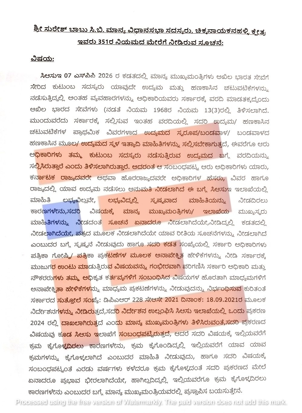 ಅಲ್ಲದೇ ಇಲಾಖೆಯಲ್ಲಿ ಈ ಮಾಹಿತಿ ಲಭ್ಯವಿದ್ದಲ್ಲಿ ಸ್ಪಷ್ಟವಾದ ಮಾಹಿತಿ ನೀಡದಿರಲು ಕಾರಣಗಳೇನು, ಈ ಸಂಬಂಧ ಮುಖ್ಯಮಂತ್ರಿಗಳು, ಇಲಾಖೆಯ ಮುಖ್ಯಸ್ಥರು ಮಾಹಿತಿಗಳನ್ನು ನೀಡದಂತೆ ಸೂಚನೆ ಏನಾದರೂ ನೀಡಲಾಗಿದೆಯೇ, ನೀಡಿದಲ್ಲಿ ಕಡತದಲ್ಲಿ ನೀಡಲಾಗಿದೆಯೇ, ಪತ್ರದ ಮೂಲಕ ನೀಡಲಾಗಿದೆಯೇ ಎಂದು ಸುರೇಶ್ ಬಾಬು ನಿಯಮ 351ರ ಅಡಿಯ ಸೂಚನೆಯಲ್ಲಿ ಪ್ರಶ್ನಿಸಿದ್ದರು.