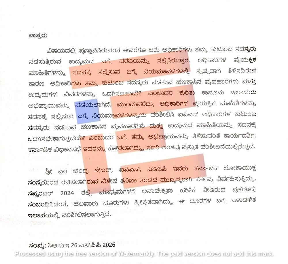 ಅದೇ ರೀತಿ ಅಧಿಕಾರಿಗಳ ವೈಯಕ್ತಿಕ ಮಾಹಿತಿಗಳನ್ನು ಸದನಕ್ಕೆ ಸಲ್ಲಿಸುವ ಬಗ್ಗೆ ನಿಯಮಾವಳಿಗಳ ಅನ್ವಯ ಪರಿಶೀಲಿಸಿ ಐಪಿಎಸ್ ಅಧಿಕಾರಿಗಳ ಕುಟುಂಬ ಸದಸ್ಯರು ನಡೆಸುವ ಹಣಕಾಸಿನ ವ್ಯವಹಾರಗಳು ಮತ್ತು ಉದ್ಯಮದ ಮಾಹಿತಿಯನ್ನು ಸದನಕ್ಕೆ ಒದಗಿಸಬೇಕಾಗುತ್ತದೆಯೇ ಎಂಬ ಬಗ್ಗೆ ಕರ್ನಾಟಕ ವಿದಾನಸಭೆ ಸಚಿವಾಲಯದ ಕಾರ್ಯದರ್ಶಿ ಅವರ ಅಭಿಪ್ರಾಯ ಕೋರಿದೆ. ಸದ್ಯ ಈ ಅಂಶವು ಪರಿಶೀಲನೆಯಲ್ಲಿದೆ ಎಂದು ಮುಖ್ಯಮಂತ್ರಿ ಸಿದ್ದರಾಮಯ್ಯ ಅವರು ಉತ್ರರಿಸಿದ್ದಾರೆ.
