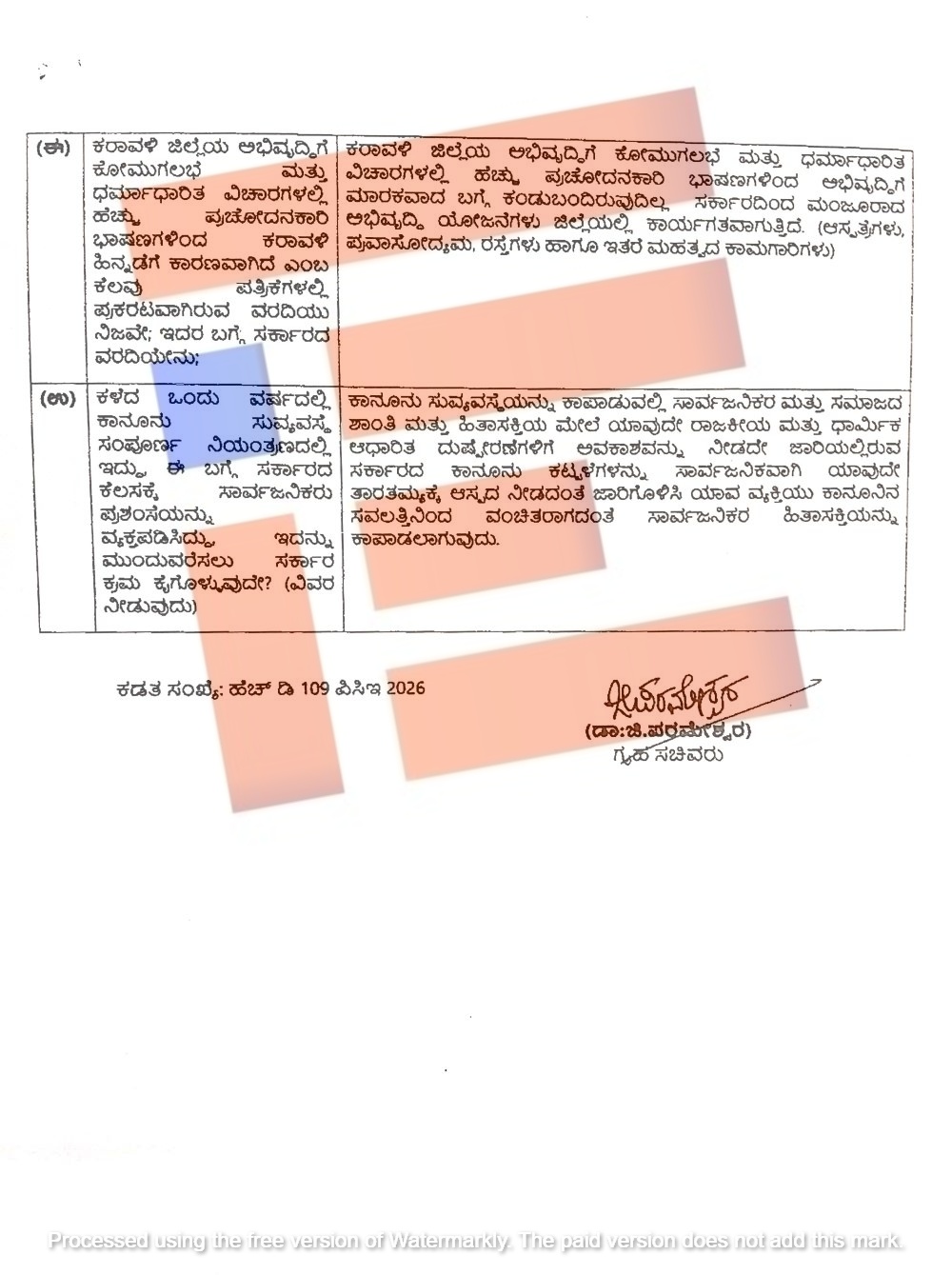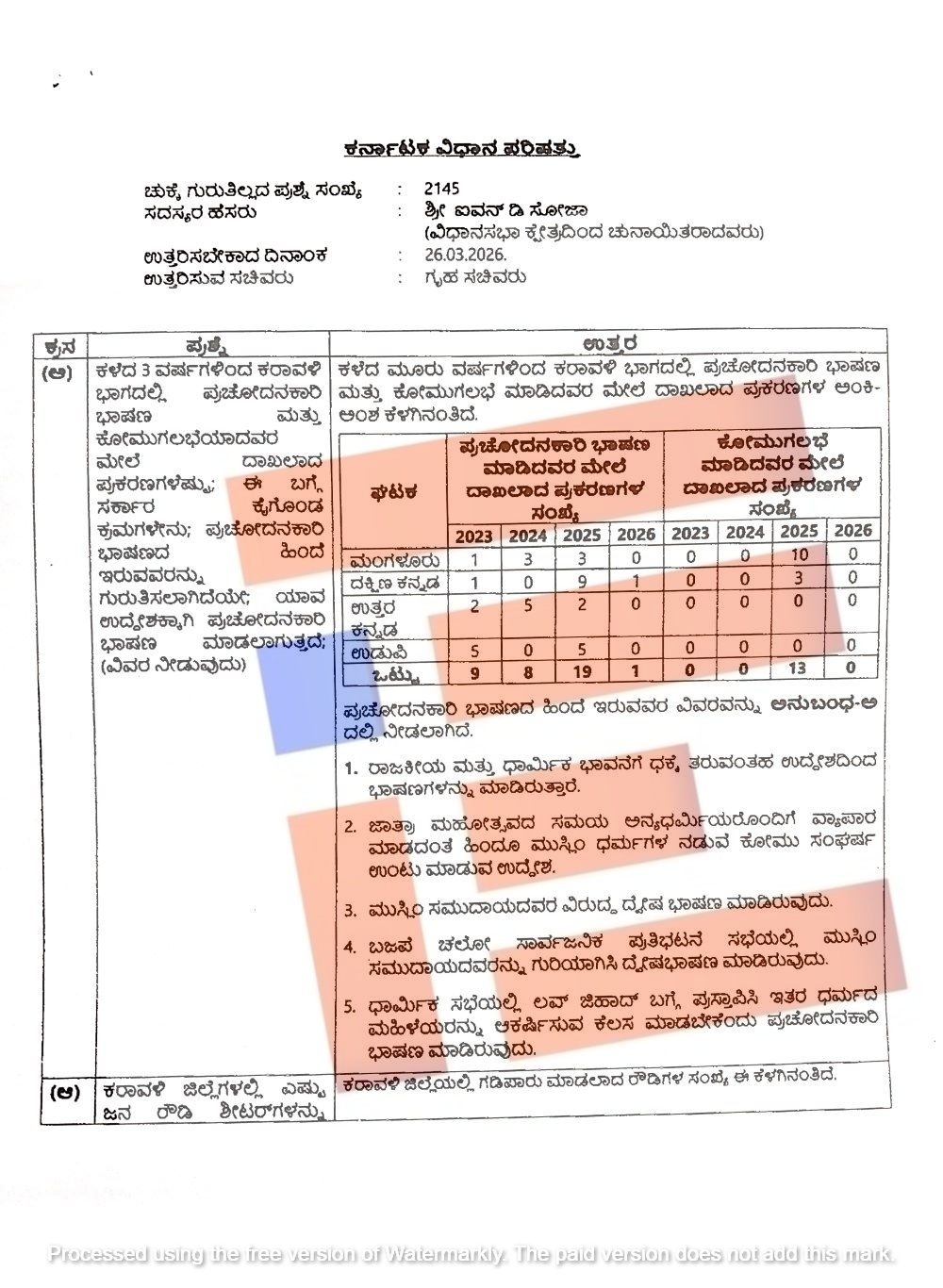 ಕಳೆದ 3 ವರ್ಷಗಳಿಂದ ಕರಾವಳಿ ಭಾಗದಲ್ಲಿ ಪ್ರಚೋದನಾಕಾರಿ ಭಾಷಣ ಮತ್ತು ಕೋಮುಗಲಭೆಯಾದವರ ವಿರುದ್ಧ ದಾಖಲಾಗಿರುವ ಪ್ರಕರಣಗಳು ಮತ್ತು ಈ ಬಗ್ಗೆ ಸರ್ಕಾರವು ಕೈಗೊಂಡಿರುವ ಕ್ರಮಗಳ ಕುರಿತು ವಿಧಾನ ಪರಿಷತ್ನಲ್ಲಿ ಶಾಸಕ ಐವನ್ ಡಿ ಸೋಜಾ ಅವರು ಕೇಳಿದ್ದ ಪ್ರಶ್ನೆಗೆ ಗೃಹ ಸಚಿವ ಡಾ ಜಿ ಪರಮೇಶ್ವರ್ ಅವರು ಪ್ರಕರಣಗಳ ವಿವರಗಳನ್ನು ಸದನಕ್ಕೆ ಮಂಡಿಸಿದ್ದಾರೆ.