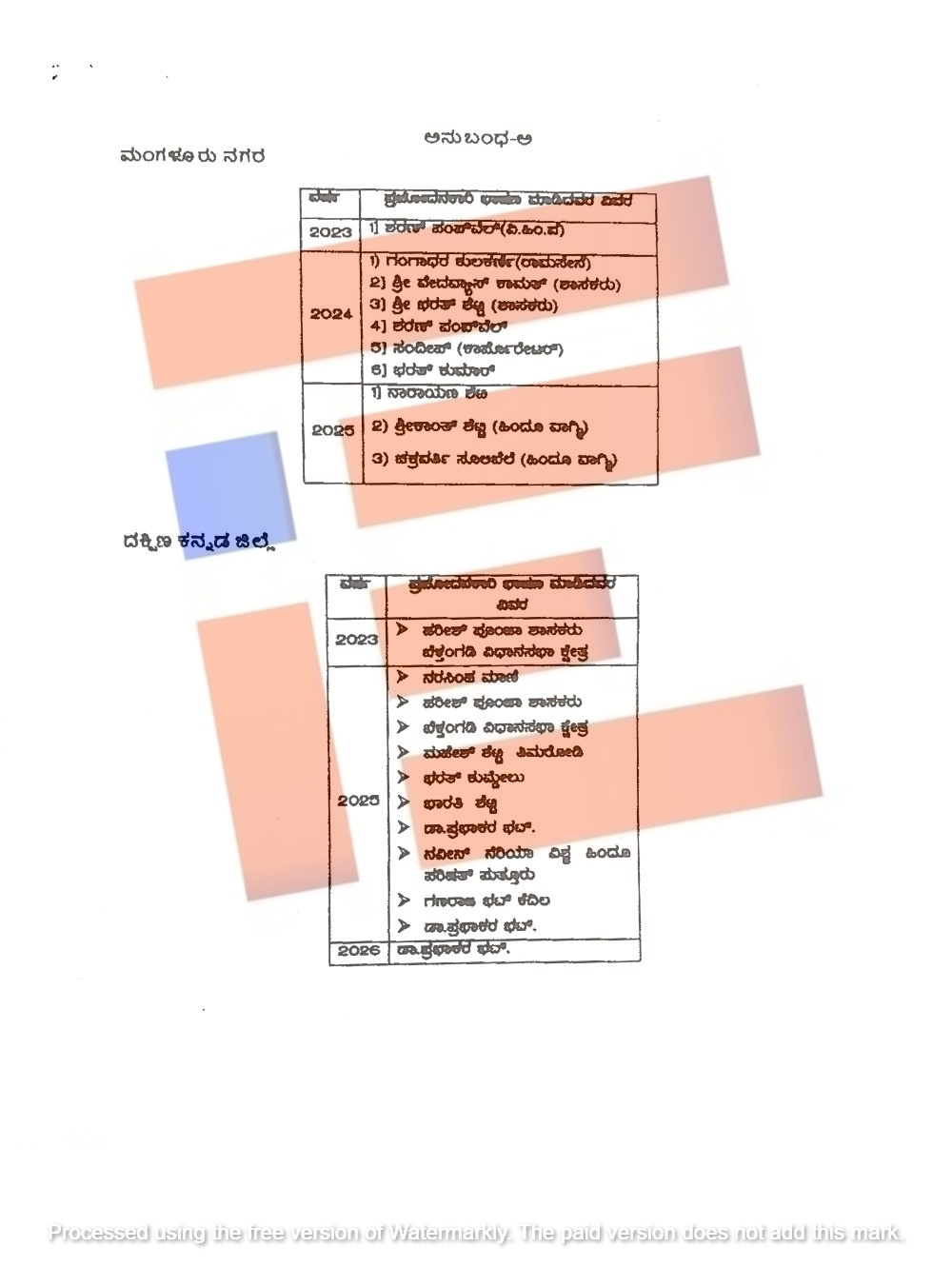 ಶಾಸಕ ಹರೀಶ್ ಪೂಂಜಾ, ನರಸಿಂಹ ಮಾಣಿ, ಮಹೇಶ್ ಶೆಟ್ಟಿ ತಿಮರೋಡಿ, ಭರತ್ ಕುಮೈಲು, ಡಾ ಪ್ರಭಾಕರ್ ಭಟ್, ವಿಶ್ವ ಹಿಂದೂ ಪರಿಷತ್ನ ಪುತ್ತೂರಿನ ನವೀನ್ ನೆರಿಯಾ, ಭಾರತಿ ಶೆಟ್ಟಿ, ಗಣರಾಜ ಭಟ್ ಕೆದಿಲ ಅವರು 2023ರಿಂದ 2026ರವರೆಗೆ ಪ್ರಚೋದನಾಕಾರಿ ಭಾಷಣ ಮಾಡಿದ್ದಾರೆ. ವಿಶೇಷವೆಂದರೇ ಹರೀಶ್ ಪೂಂಜಾ ಅವರು 2023, 2025 ರಲ್ಲಿ ಡಾ ಪ್ರಭಾಕರ್ ಭಟ್ ಅವರು 2023 ಮತ್ತು 2025, 2026ರಲ್ಲಿಯೂ ಪ್ರಚೋದನಾಕಾರಿ ಭಾಷಣ ಮಾಡಿದ್ದಾರೆ ಎಂದು ಪಟ್ಟಿಯಿಂದ ಗೊತ್ತಾಗಿದೆ.