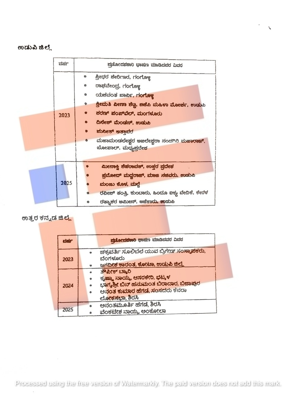 ಗಂಗೊಳ್ಳಿಯ ಶ್ರೀಧರ ಶೇರಿಗಾರ, ರಾಘವೇಂದ್ರ, ಯಶವಂತ ಖಾರ್ವಿ, ಉಡುಪಿ ಬಿಜೆಪಿಯ ಮಹಿಳಾ ಮೋರ್ಚಾದ ವೀಣಾ ಶೆಟ್ಟಿ, ಶರಣ್ ಪಂಪ್ ವೆಲ್, ದಿನೇಶ್ ಮೆಂಡನ್, ಪುನೀತ್ ಅತ್ತಾವರ, ಮಧ್ಯ ಪ್ರದೇಶ ಭೋಪಾಲ್ನ ಮಹಾಮಂಡಲೇಶ್ವರ ಅಖಿಲೇಶ್ವರಾ ನಂದಗಿರಿ ಮಹಾರಾಜ್, ಉತ್ತರ ಪ್ರದೇಶದ ಮೀನಾಕ್ಷಿ ಶೆಹರಾವತ್, ಪ್ರಮೋದ್ ಮಧ್ವೃರಾಜ್, ಮಲ್ಪೆಯ ಮಂಜು ಕೊಳ, ಕೇರಳ ಹಿಂದೂ ಐಕ್ಯ ವೇದಿಕೆಯ ರವೀಶ್ ತಂತ್ರಿ ಅವರು 2023ರಿಂದ 2025ರವರೆಗೆ ವಿವಿಧ ದಿನಾಂಕಗಳಂದು ಪ್ರಚೋದನಾಕಾರಿ ಭಾಷಣ ಮಾಡಿರುವುದು ಪಟ್ಟಿಯಿಂದ ತಿಳಿದು ಬಂದಿದೆ.