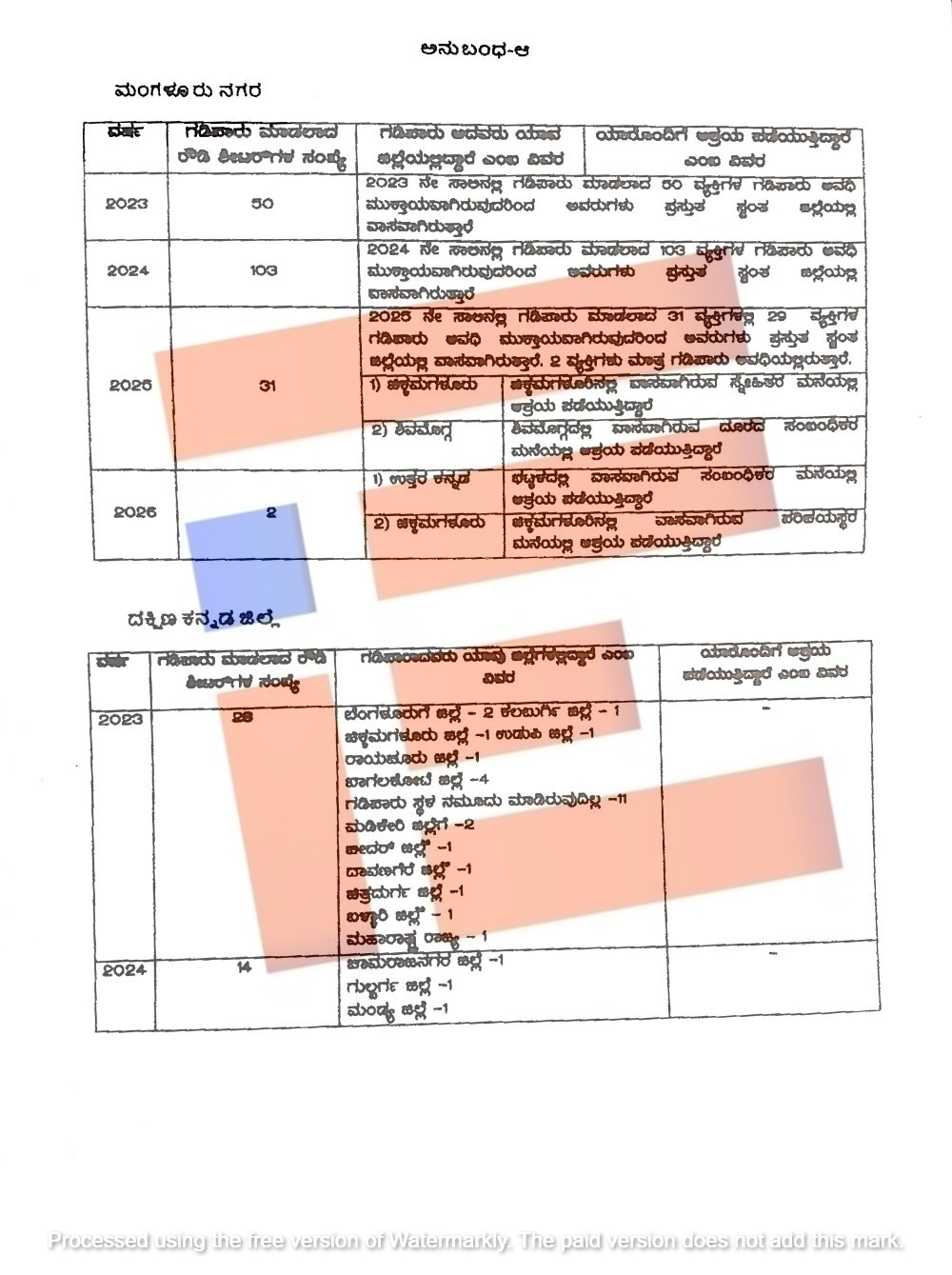 ಈ ಪಟ್ಟಿಯ ಪ್ರಕಾರ 2023ರಿಂದ 2026ರವರೆಗೆ ಒಟ್ಟಾರೆ 274 ಮಂದಿ ರೌಡಿ ಶೀಟರ್ಗಳನ್ನು ಗಡಿಪಾರು ಮಾಡಲಾಗಿದೆ. 2023ರಲ್ಲಿ 97, 2024ರಲ್ಲಿ 127, 2025ರಲ್ಲಿ 48 ಮತ್ತು 2026ರಲ್ಲಿ ಮೂವರು ರೌಡಿ ಶೀಟರ್ಗಳನ್ನು ಗಡಿಪಾರು ಮಾಡಿರುವುದು ಗೊತ್ತಾಗಿದೆ.