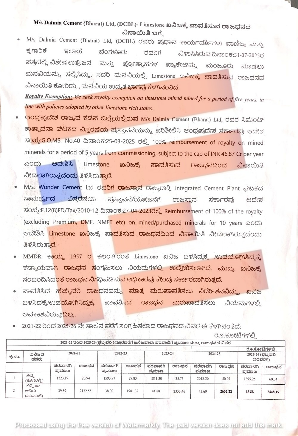 ಅದೇ ರೀತಿ ವಂಡರ್ ಸಿಮೆಂಟ್ಸ್ ಲಿಮಿಟೆಡ್ಗೆ ಇಂಟಿಗ್ರೇಟೆಡ್ ಸಿಮೆಂಟ್ ಪ್ಲಾಂಟ್ ಘಟಕ ಸಾಮರ್ಥ್ಯದ ವಿಸ್ತರಣೆಗಾಗಿ ರಾಜಸ್ಥಾನ ಸರ್ಕಾರವು ರಾಜಧನದಿಂದ ವಿನಾಯಿತಿ ನೀಡಿ ಆದೇಶಿಸಿದೆ ಎಂದು ತಿಳಿಸಿರುವ ದಾಲ್ಮಿಯಾ ಕಂಪನಿಯು, ಕರ್ನಾಟಕದಲ್ಲಿಯೂ ಇದೇ ಮಾದರಿಯಲ್ಲಿ ಸುಣ್ಣದ ಕಲ್ಲು ಖನಿಜಕ್ಕೆ ಪಾವತಿಸುವ ರಾಜಧನದಿಂದ ವಿನಾಯಿತಿ ನೀಡಬೇಕು ಎಂದು ಕೋರಿರುವುದು ಗೊತ್ತಾಗಿದೆ.