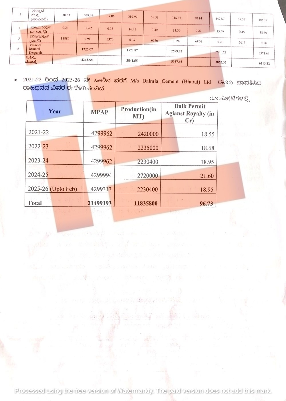 ಸಗಟು ಪರವಾನಿಗೆಗೆ ವಿರುದ್ಧವಾಗಿ 2021-22ರಲ್ಲಿ 18.55 ಕೋಟಿ, 2022-23ರಲ್ಲಿ 18.68 ಕೋಟಿ, 2023-24ರಲ್ಲಿ 18.95 ಕೋಟಿ, 2024-25ರಲ್ಲಿ 21.60 ಕೋಟಿ, 2025-26 (ಫೆಬ್ರುವರಿವರೆಗೆ) 18.95 ಕೋಟಿ ರು ಸೇರಿ ಒಟ್ಟಾರೆ 96.73 ಕೋಟಿ ರುಪಾಯಿ ಪಾವತಿಸಿದೆ. ಇದೀಗ ದಾಲ್ಮಿಯಾ ಸಿಮೆಂಟ್ಸ್ ಕಂಪನಿಯು ವಿಶೇಷ ಉತ್ತೇಜನ ಮತ್ತು ಪ್ರೋತ್ಸಾಹ ಯೋಜನೆಯಡಿಯಲ್ಲಿ ಇದೇ 96.73 ಕೋಟಿ ರುಪಾಯಿಗಳೀಗೆ ವಿನಾಯಿತಿ ಕೋರಿದೆ.