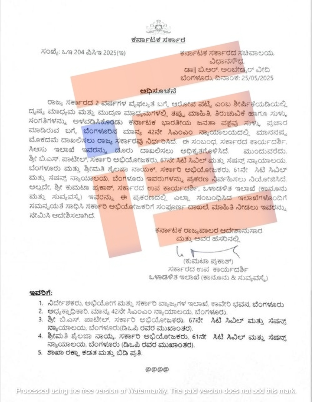 ರಾಜ್ಯ ಸರ್ಕಾರದ ವಿರುದ್ಧ ಕರ್ನಾಟಕ ಭಾರತೀಯ ಜನತಾಪಕ್ಷವು ಸುಳ್ಳು ಪ್ರಚಾರ ಮಾಡುತ್ತಿರುವ ಬಗ್ಗೆ 42ನೇ ಮುಖ್ಯ ಮೆಟ್ರೋಪಾಲಿಟನ್ ಮ್ಯಾಜಿಸ್ಟ್ರೇಟ್ ನ್ಯಾಯಾಲಯದಲ್ಲಿ ಮಾನನಷ್ಟ ಪ್ರಕರಣದ ಕುರಿತು ದೂರು ದಾಖಲಿಸುವ ಕುರಿತು 2025ರ ಜುಲೈ 30ರಂದೇ ಪತ್ರ ಬರೆದಿತ್ತು.