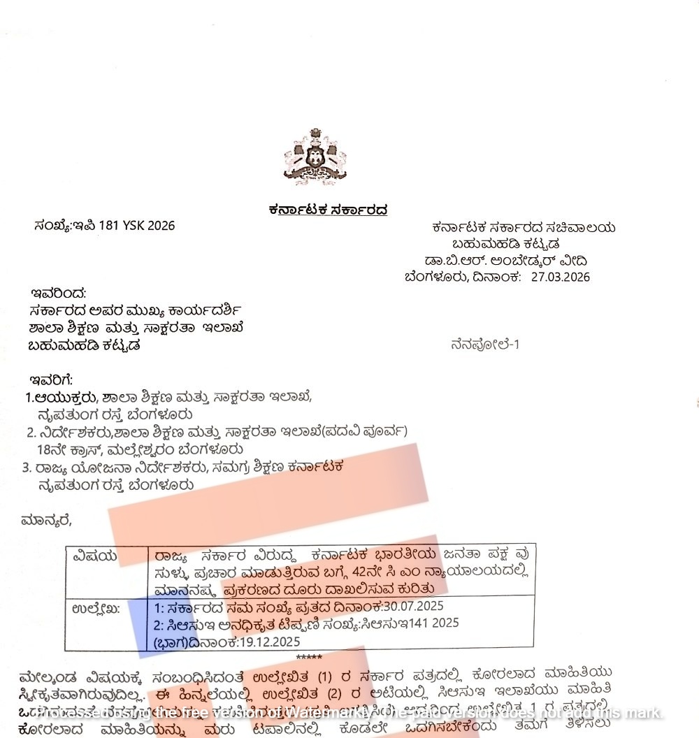 ಆದ್ದರಿಂದ 2025ರ ಜುಲೈ 30ರ ಪತ್ರದಲ್ಲಿ ಕೋರಲಾದ ಮಾಹಿತಿಯನ್ನು ಮರು ಟಪಾಲಿನಲ್ಲಿ ಕೂಡಲೇ ಒದಗಿಸಬೇಕು ಎಂದು ಶಾಲಾ ಶಿಕ್ಷಣ ಮತ್ತು ಸಾಕ್ಷರತೆ ಇಲಾಖೆಯ ಸರ್ಕಾರದ ವಿಶೇಷಾಧಿಕಾರಿ ಶುಭಮಂಗಳ ಆರ್ ವಿ ಅವರು ಇಲಾಖೆಯ ಆಯುಕ್ತರು, ಪಿಯು ಮಂಡಳಿಯ ನಿರ್ದೇಶಕರು, ಸಮಗ್ರ ಶಿಕ್ಷಣ ಘಟಕದ ರಾಜ್ಯ ಯೋಜನಾ ನಿರ್ದೇಶಕರಿಗೆ ನಿರ್ದೇಶಿಸಿರುವುದು ಪತ್ರದಿಂದ ತಿಳಿದು ಬಂದಿದೆ.