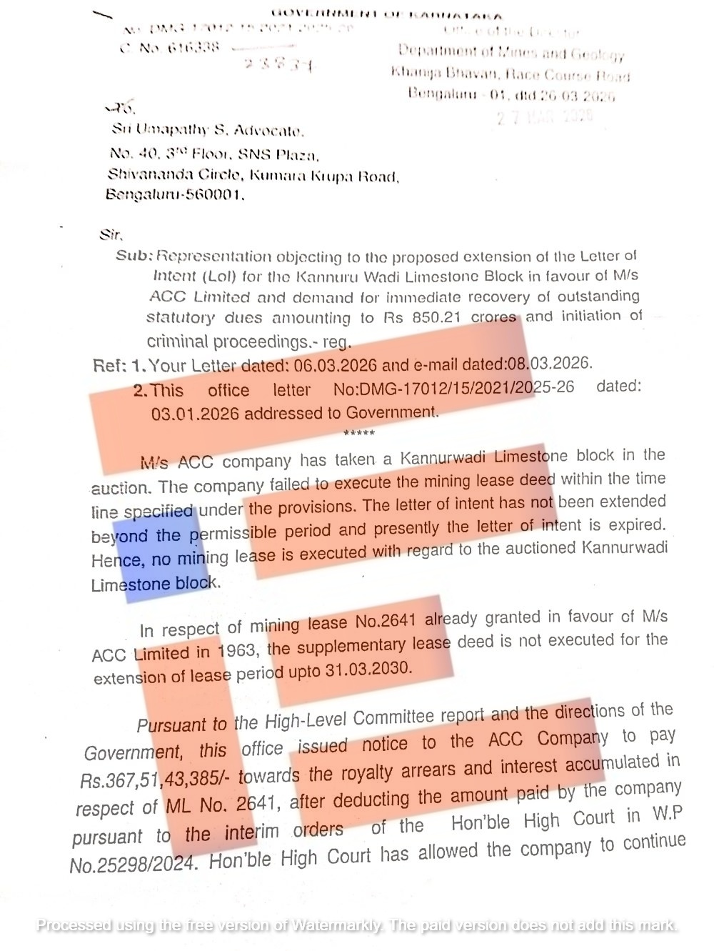 ಈ ಸಂಬಂಧ 2026ರ ಮಾರ್ಚ್ 7ರಂದು ಎಸಿಸಿ ಲಿಮಿಟೆಡ ಉತ್ತರವನ್ನು ಸಲ್ಲಿಸಿದೆ. ಕಂಪನಿಯ ಉತ್ತರವನ್ನು ಇಲಾಖೆಯು ಅಂಗೀಕರಿಸಿಲ್ಲ. ಮತ್ತು 2026ರ ಮಾರ್ಚ್ ಆದೇಶದ ಮೂಲಕ ವಸೂಲಾತಿ ಕ್ರಮ ಆರಂಭಿಸಲಾಗಿದೆ. ಜೊತೆಗೆ ಎಂಎಂಡಿಆರ್ ಕಾಯ್ದೆ ಕಲಂ 4(1), 4(1-A) ಜೊತೆಗೆ 21(1) ಮತ್ತು (2) ಅನ್ವಯ ಕ್ರಮ ಕೈಗೊಳ್ಳಲು ಕಲಬುರಗಿ ಉಪನಿರ್ದೇಶಕರಿಗೆ ನಿರ್ದೇಶಿಸಲಾಗಿದೆ ಎಂಬ ಮಾಹಿತಿ ಒದಗಿಸಿರುವುದು ಗೊತ್ತಾಗಿದೆ.