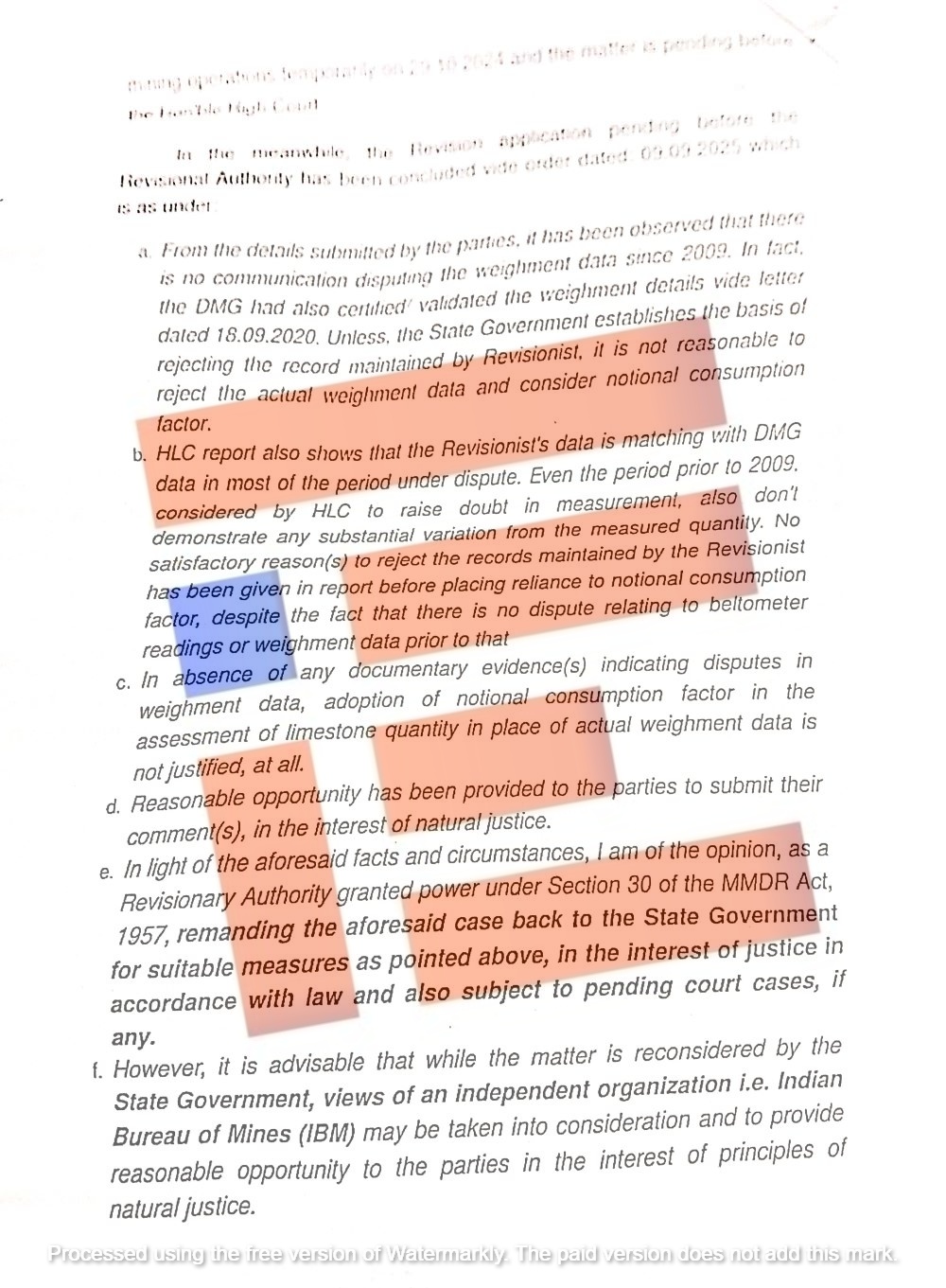 ಆದರೂ ಈ ವಿಷಯವನ್ನು ರಾಜ್ಯ ಸರ್ಕಾರ ಮರುಪರಿಶೀಲಿಸುವ ಸಂದರ್ಭದಲ್ಲಿ, ಸ್ವತಂತ್ರ ಸಂಸ್ಥೆಯಾದ ಇಂಡಿಯನ್ ಬ್ಯೂರೋ ಆಫ್ ಮೈನ್ಸ್ (IBM) ಅಭಿಪ್ರಾಯಗಳನ್ನು ಪರಿಗಣಿಸುವುದು ಸೂಕ್ತವಾಗಿದೆ. ನೈಸರ್ಗಿಕ ನ್ಯಾಯತತ್ತ್ವದ ಹಿತದೃಷ್ಟಿಯಿಂದ ಸಂಬಂಧಿಸಿದ ಪಕ್ಷಗಳಿಗೆ ಸಮರ್ಪಕ ಅವಕಾಶವನ್ನು ಒದಗಿಸುವುದು ಅವಶ್ಯಕವಾಗಿದೆ.ಈ ರಿವಿಷನರಿ ಪ್ರಾಧಿಕಾರದ ಆದೇಶವನ್ನು ಕರ್ನಾಟಕ ರಾಜ್ಯವು ಗೌರವಾನ್ವಿತ ಹೈಕೋರ್ಟ್ನಲ್ಲಿ (W.P No. 36580/2025 ) ಪ್ರಶ್ನಿಸಿದ್ದು ಈ ವಿಷಯವು ಹೈಕೋರ್ಟ್ನಲ್ಲಿ ಬಾಕಿಯಾಗಿದೆ.