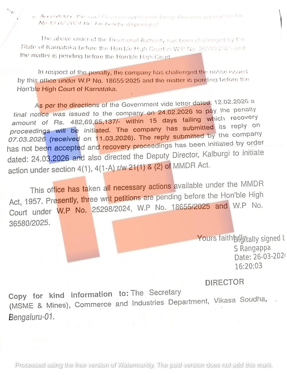 ದಂಡದ ವಿಷಯದಲ್ಲಿ, ಈ ಕಚೇರಿಯಿಂದ ನೀಡಲಾದ ನೋಟಿಸ್ನ್ನು ಕಂಪನಿಯು (W.P No. 18655/2025 ) ಮೂಲಕ ಪ್ರಶ್ನಿಸಿದೆ. ಈ ವಿಷಯವೂ ಕರ್ನಾಟಕ ಹೈಕೋರ್ಟ್ ಮುಂದೆ ಬಾಕಿಯಾಗಿದೆ. ಸರ್ಕಾರದ ನಿರ್ದೇಶನದಂತೆ, 2026ರ ಫೆ.12ರ ಪತ್ರದ ಆಧಾರದ ಮೇಲೆ, ಕಂಪನಿಗೆ 2026ರ ಫೆ.24ರಂದು ಅಂತಿಮ ನೋಟಿಸ್ ನೀಡಲಾಗಿದೆ. ರೂ. 482,69,65,137/- ದಂಡ ಮೊತ್ತವನ್ನು 15 ದಿನಗಳೊಳಗೆ ಪಾವತಿಸಲು ಸೂಚಿಸಲಾಗಿದೆ. ಪಾವತಿಸದಿದ್ದಲ್ಲಿ ವಸೂಲಾತಿ ಕ್ರಮ ಕೈಗೊಳ್ಳಲಾಗುವುದು ಎಂದು ತಿಳಿಸಲಾಗಿದೆ.