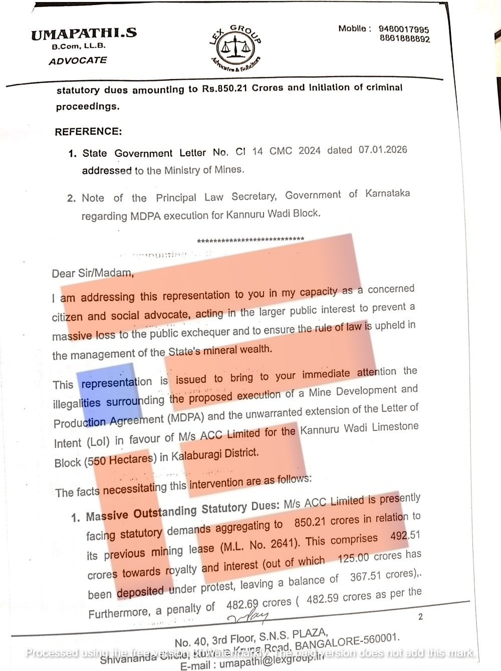 ಕಲ್ಬುರ್ಗಿಯ ಕಣ್ಣೂರು ವಾಡಿಯಲ್ಲಿನ ಸುಣ್ಣದ ಕಲ್ಲು ಗಣಿಗಾರಿಕೆಗೆ ಗುತ್ತಿಗೆ ಪಡೆದಿದ್ದ ಅದಾನಿ ಸಮೂಹದ ಎಸಿಸಿ ಸಿಮೆಂಟ್ಸ್ ಲಿಮಿಟೆಡ್ ಅಕ್ರಮವಾಗಿ ಗಣಿಗಾರಿಕೆ ನಡೆಸಿತ್ತು. ಮತ್ತು ಶಾಸನಬದ್ಧವಾಗಿ ರಾಜ್ಯ ಸರ್ಕಾರಕ್ಕೆ ಸಂದಾಯ ಮಾಡಬೇಕಿದ್ದ ರಾಜಧನ ಪಾವತಿಸಿರಲಿಲ್ಲ. ಅಲ್ಲದೇ ಅಕ್ರಮವಾಗಿ ಗಣಿಗಾರಿಕೆ ನಡೆಸಿದ್ದರಿಂದಾಗಿ ರಾಜ್ಯ ಸರ್ಕಾರವು ವಿಧಿಸಿದ್ದ ದಂಡದ ಮೊತ್ತವನ್ನೂ ಪಾವತಿಸಿರಲಿಲ್ಲ. ಆದರೂ ಈ ಕಂಪನಿಗೆ ಲೆಟರ್ ಆಫ್ ಇಂಟೆಂಟ್ನ್ನು ಅನುಷ್ಠಾನಗೊಳಿಸುತ್ತಿರುವುದು ಸರಿಯಲ್ಲ ಎಂದು ವಕೀಲ ಉಮಾಪತಿ ಅವರು 2026ರ ಮಾರ್ಚ್ 3ರಂದೇ ಲೀಗಲ್ ನೋಟೀಸ್ ಜಾರಿಗೊಳಿಸಿದ್ದರು.
