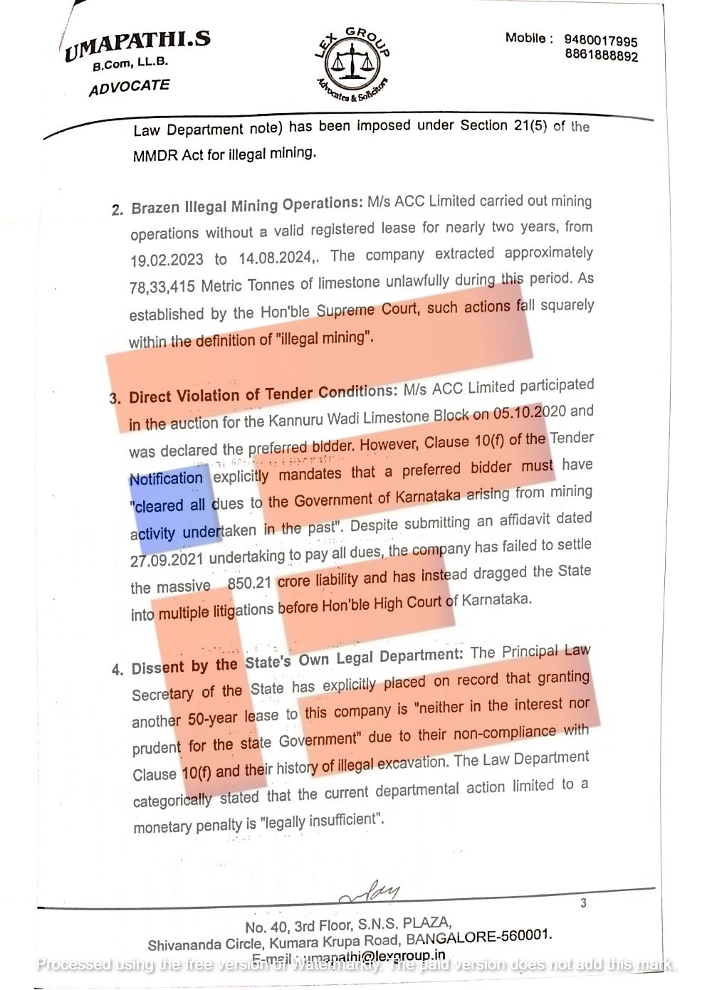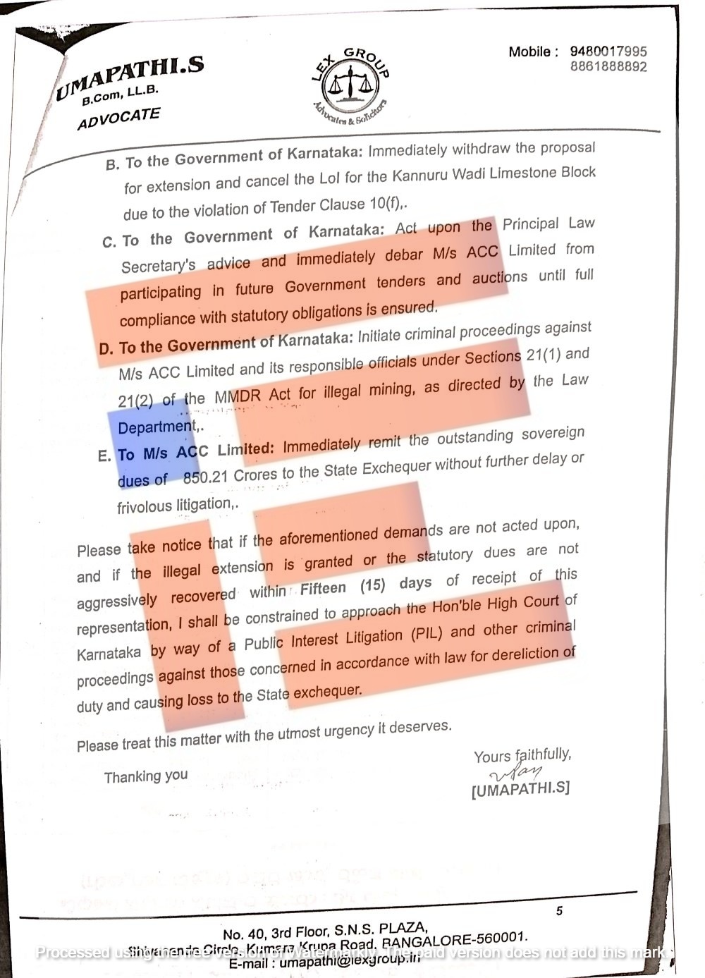 ಎಸಿಸಿ ಸಿಮೆಂಟ್ಸ್ ಪರವಾಗಿ ಲೆಟರ್ ಆಫ್ ಇಂಟೆಂಟ್ನ್ನು ವಿಸ್ತರಿಸಲು ಕರ್ನಾಟಕ ಸರ್ಕಾರವು 2026ರ ಜನವರಿ 7ರಂದು ಸಲ್ಲಿಸಿರುವ ಪ್ರಸ್ತಾವನೆಯನ್ನು ತಿರಸ್ಕರಿಸಬೇಕು. ಈ ಪ್ರಸ್ತಾವನೆ ಎಂಎಂಡಿಆರ್ ಕಾಯ್ದೆಯ ಕಲಂ 31 ಅಡಿಯಲ್ಲಿ ಎಸಿಸಿ ಲಿಮಿಟೆಡ್ಗೆ ಒಂದು ವರ್ಷದ ಅವಧಿಗೆ ಲೆಟರ್ ಆಫ್ ಇಂಟೆಂಟ್ ವಿಸ್ತರಿಸಲು ಕೋರಿದೆ. ಅದೇ ರೀತಿ ರಾಜ್ಯ ಸರ್ಕಾರವು ಎಸಿಸಿ ಸಿಮೆಂಟ್ಸ್ ಲಿಮಿಟೆಡ್ ಗೆ ಲೆಟರ್ ಆಫ್ ಇಂಟೆಂಟ್ನ್ನು ವಿಸ್ತರಿಸಲು ಸಲ್ಲಿಸಲಾದ ಪ್ರಸ್ತಾವನೆಯನ್ನು ತಕ್ಷಣ ಹಿಂತೆಗೆದುಕೊಳ್ಳಬೇಕು. ಮತ್ತು ಟೆಂಡರ್ ಕಲಂ 10(f) ಉಲ್ಲಂಘನೆಯ ಕಾರಣದಿಂದ ಕಣ್ಣೂರು ವಾಡಿಯಲ್ಲಿನ ಸುಣ್ಣದ ಕಲ್ಲು ಬ್ಲಾಕ್ ಗೆ ನಿಡಿರುವ ಲೆಟರ್ ಆಫ್ ಇಂಟೆಂಟ್ನ್ನು ರದ್ದುಗೊಳಿಸಬೇಕು ಎಂದು ಲೀಗಲ್ ನೋಟೀಸ್ನಲ್ಲಿ ತಿಳಿಸಿರುವುದು ಗೊತ್ತಾಗಿದೆ.
