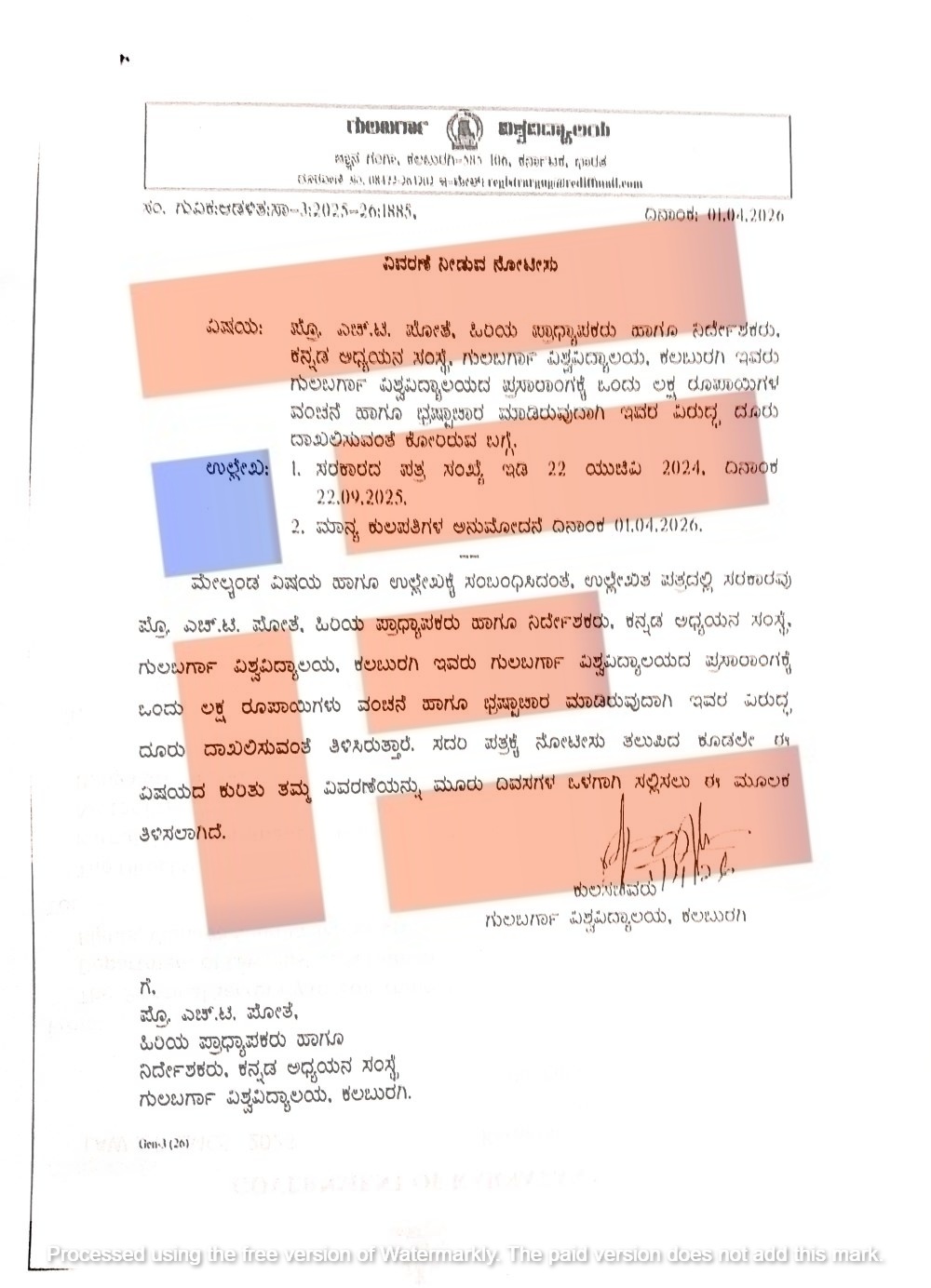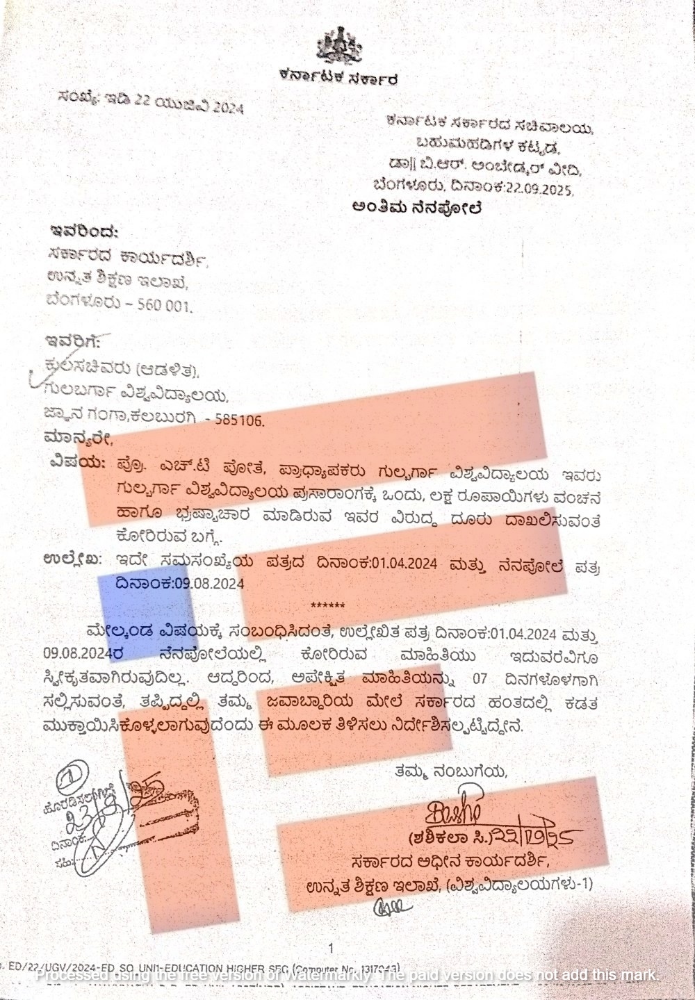 ‘ಪ್ರೊ ಎಚ್ ಟಿ ಪೋತೆ ಅವರು ಗುಲ್ಬರ್ಗ ವಿಶ್ವವಿದ್ಯಾಲಯದ ಪ್ರಸಾರಾಂಗಕ್ಕೆ ಒಂದು ಲಕ್ಷ ರುಪಾಯಿ ವಂಚನೆ ಮತ್ತು ಭ್ರಷ್ಟಾಚಾರ ಮಾಡಿರುವ ಇವರ ವಿರುದ್ಧ ದೂರು ದಾಖಲಿಸುವಂತೆ ಕೋರಿರುವ ಬಗ್ಗೆ 2024ರ ಏಪ್ರಿಲ್ 1 ಮತ್ತು 2024ರ ಆಗಸ್ಟ್ 9ರಂದು ನೆನಪೋಲೆಯಲ್ಲಿ ಮಾಹಿತಿ ಕೋರಿತ್ತು. ಅಪೇಕ್ಷಿತ ಮಾಹಿತಿಯನ್ನು 07 ದಿನದೊಳಗೆ ಸಲ್ಲಿಸಬೇಕು. ತಪ್ಪಿದ್ದಲ್ಲಿ ತಮ್ಮ ಜವಾಬ್ದಾರಿ ಮೇಲೆ ಸರ್ಕಾರದ ಹಂತದಲ್ಲಿ ಕಡತ ಮುಕ್ತಾಯಗೊಳಿಸಲಾಗುವುದು,’ ಎಂದು ಉನ್ನತ ಶಿಕ್ಷಣ ಇಲಾಖೆಯ ಸರ್ಕಾರದ ಕಾರ್ಯದರ್ಶಿ 2025ರ ಸೆ.22ರಂದೇ ಅಂತಿಮ ನೆನಪೋಲೆಯಲ್ಲಿ ಎಚ್ಚರಿಸಿದ್ದರು.