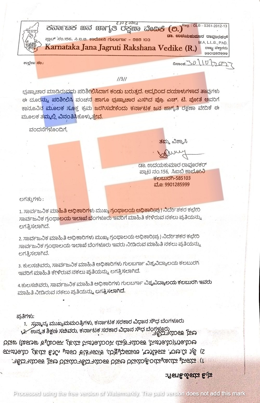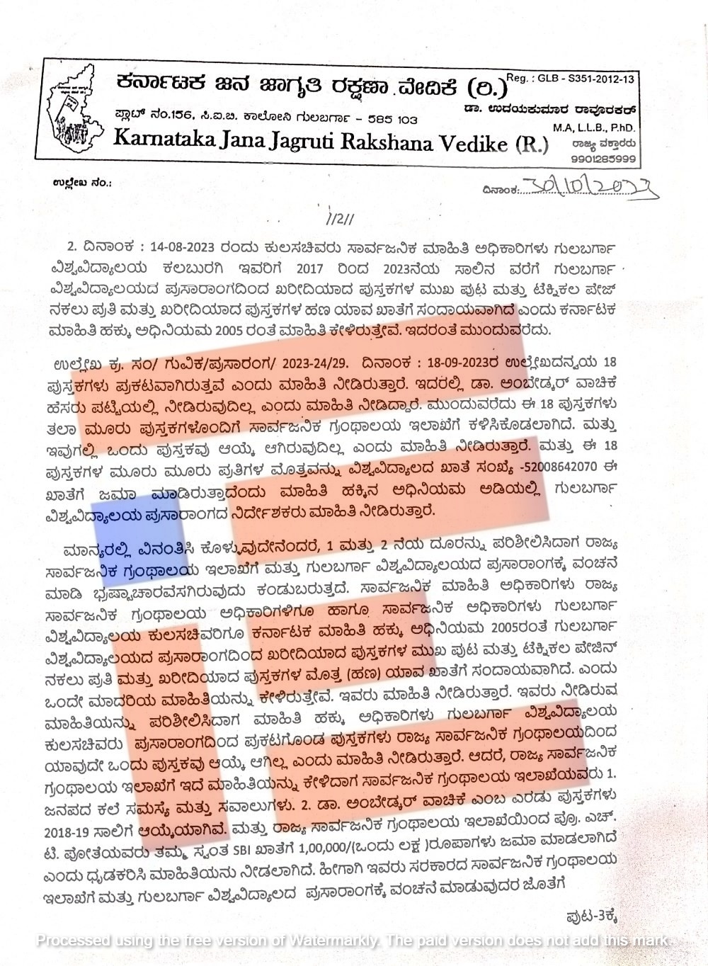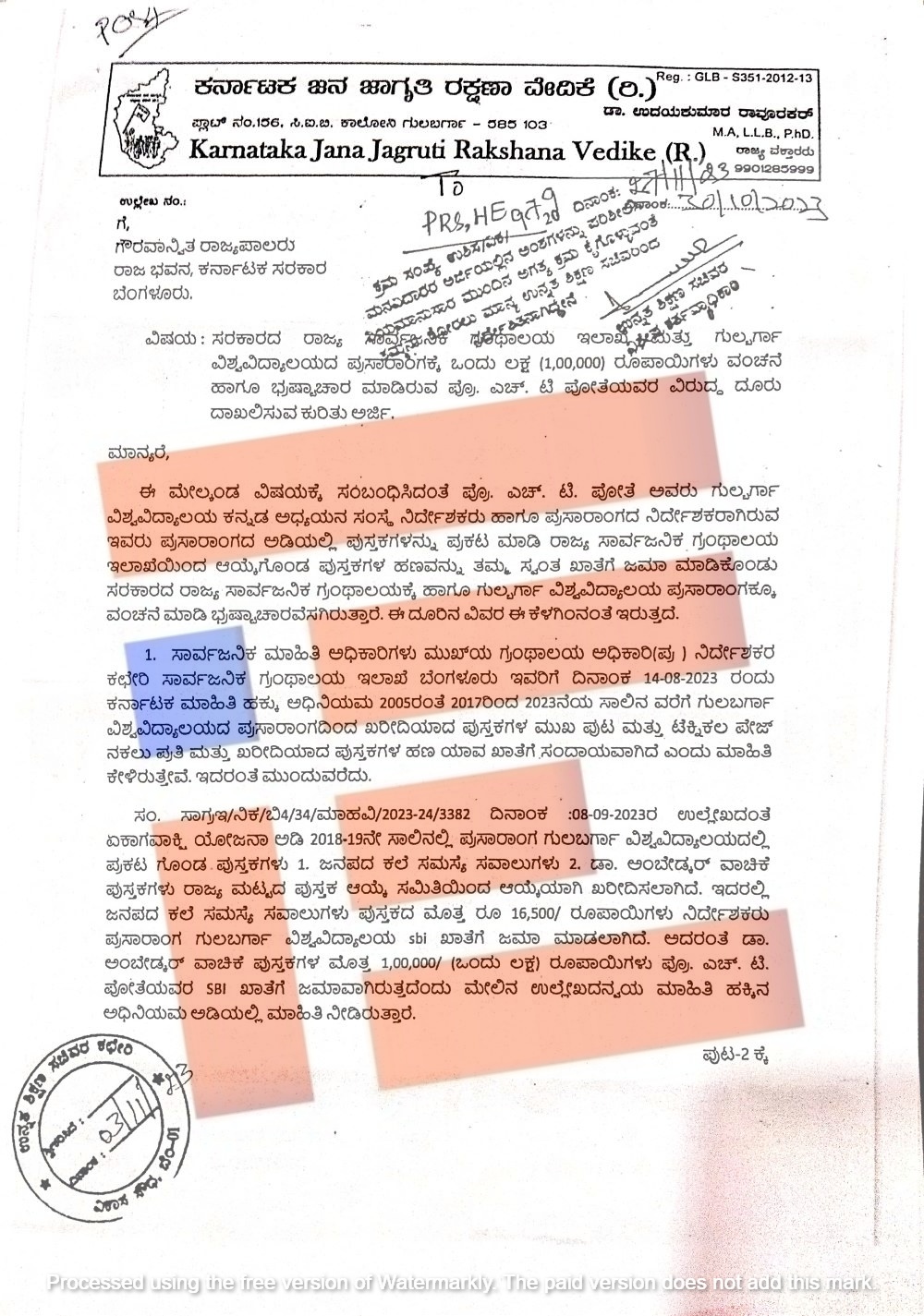 ‘1 ಮತ್ತು 2ನೇ ದೂರನ್ನು ಪರಿಶೀಲಿಸಿದಾಗ ರಾಜ್ಯ ಸಾರ್ವಜನಿಕ ಗ್ರಂಥಾಲಯ ಇಲಾಖೆಗೆ ಮತ್ತು ಗುಲ್ಬರ್ಗ ವಿಶ್ವವಿದ್ಯಾಲಯದ ಪ್ರಸಾರಾಂಗಕ್ಕೆ ವಂಚನೆ ಮಾಡಿ ಭ್ರಷ್ಟಾಚಾರ ಎಸಗಿರುವುದು ಕಂಡು ಬರುತ್ತದೆ,’ ಎಂದು ವೇದಿಕೆಯು ದೂರಿನಲ್ಲಿ ಅರೋಪಿಸಿತ್ತು.