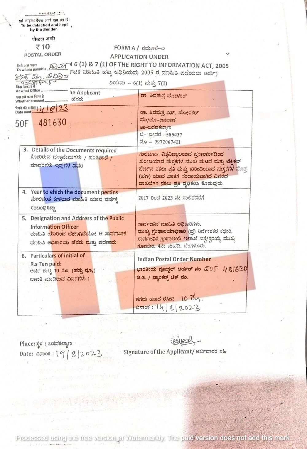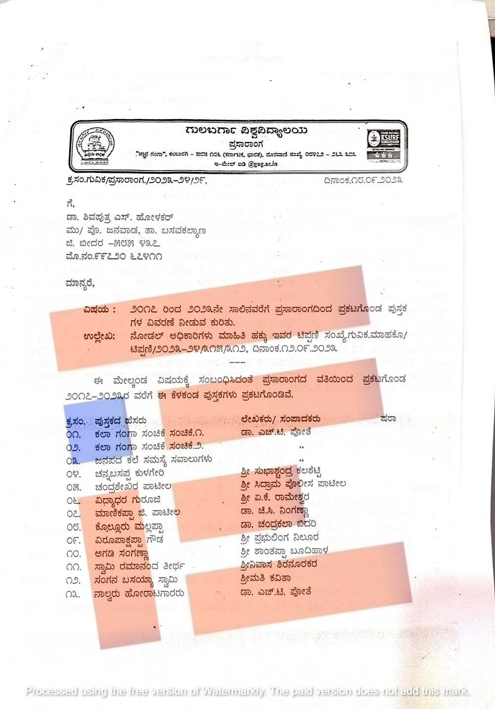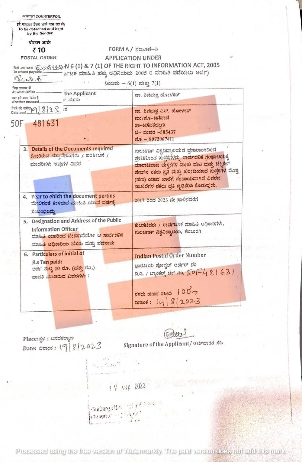 2017ರಿಂದ 2023ರವರೆಗೆ ಕಲ್ಬುರ್ಗಿ ವಿಶ್ವವಿದ್ಯಾಲಯದ ಪ್ರಸಾರಾಂಗದಿಂದ ಖರೀದಿಯಾಗಿದ್ದ ಪುಸ್ತಕಗಳ ಮುಖಪುಟ, ಟೆಕ್ನಿಕಲ್ ಪೇಜ್ ನಕಲು ಪ್ರತಿ ಮತ್ತು ಖರೀದಿಯಾದ ಪುಸ್ತಕಗಳ ಹಣ ಯಾವ ಖಾತೆಗೆ ಸಂದಾಯವಾಗಿದೆ ಎಂಬ ಮಾಹಿತಿಯನ್ನೂ ಡಾ ಶಿವಪುತ್ರ ಹೋಳಕರ್ ಪಡೆದುಕೊಂಡಿದ್ದರು.