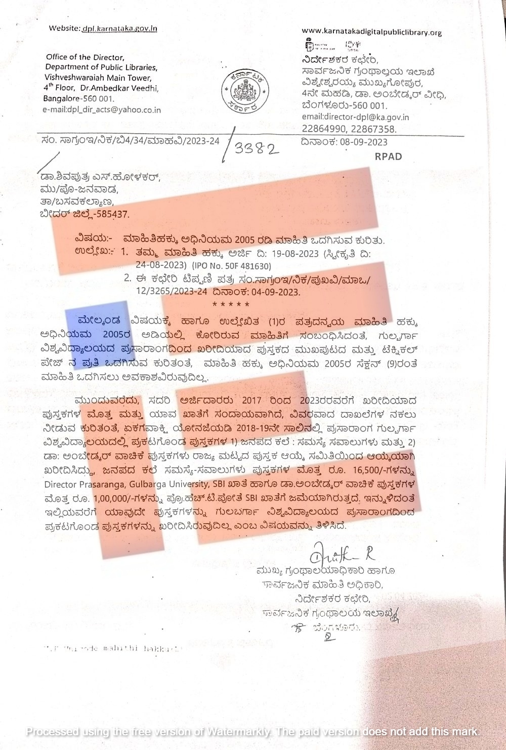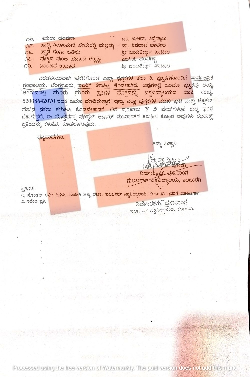 ಅದೇ ರೀತಿ 18 ಪುಸ್ರಕಗಳು ತಲಾ ಮೂರು ಪುಸ್ತಕಗಳೊಂದಿಗೆ ಸಾರ್ವಜನಿಕ ಗ್ರಂಥಾಲಯ ಇಲಾಖೆಗೆ ಕಳಿಸಿತ್ತು ಎಂದು ದೂರಿನಲ್ಲಿ ವಿವರಿಸಿದೆ. ಈ 18 ಪುಸ್ತಕಗಳ ತಲಾ ಮೂರು ಪ್ರತಿಗಳ ಮೊತ್ತವನ್ನು ವಿಶ್ವವಿದ್ಯಾಲಯದ ಖಾತೆಗೆ (ಸಂಖ್ಯೆ; 52008642070) ಜಮೆ ಮಾಡಲಾಗಿದೆ ಎಂದು ವಿಶ್ವವಿದ್ಯಾಲಯದ ಪ್ರಸಾರಾಂಗದ ನಿರ್ದೇಶಕರು ಮಾಹಿತಿ ಒದಗಿಸಿದ್ದರು.