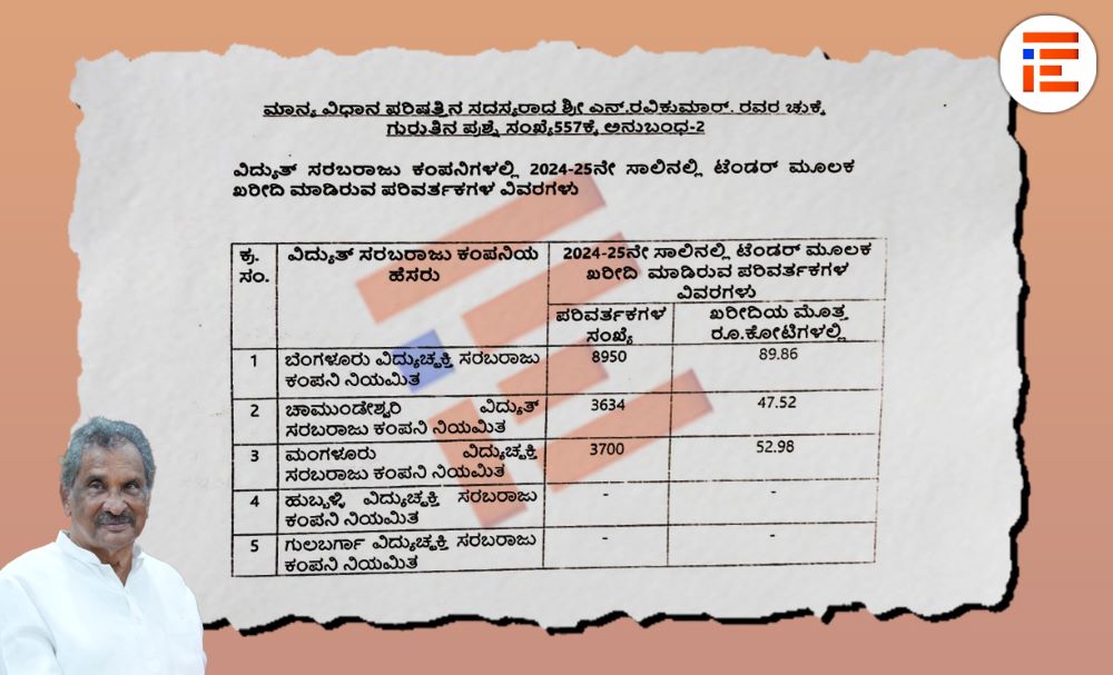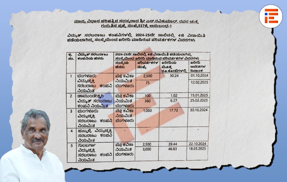 2019ರಿಂದ 2025ರ ಸೆಪ್ಟಂಬರ್‍‌ವರೆಗೆ ಒಟ್ಟಾರೆ 180.37 ಕೋಟಿ ರು ವೆಚ್ಚದಲ್ಲಿ 6,500ಕ್ಕೂ ಹೆಚ್ಚು ಪರಿವರ್ತಕಗಳನ್ನು ಕೇರಳ ಎಲೆಕ್ಟ್ರಿಕಲ್‌ ಅಲೈಡ್‌ ಇಂಜಿನಿಯರಿಂಗ್‌ ಕಂಪನಿಯಿಂದಲೇ ನೇರವಾಗಿ ಖರೀದಿಸಿದೆ.  ಆರ್ಥಿಕ ಇಲಾಖೆಯು, 2025-26ನೇ ಸಾಲಿನಲ್ಲಿ 174 ಕೋಟಿ ರು ಮೊತ್ತದದಲ್ಲಿ ಕೇರಳ ಎಲೆಕ್ಟ್ರಿಕಲ್‌ ಅಂಡ್‌ ಅಲೈಡ್‌ ಇಂಜಿನಿಯರಿಂಗ್‌ ಕಂಪನಿಯಿಂದಲೇ ವಿದ್ಯುತ್ ಪರಿವರ್ತಕಗಳನ್ನು ಖರೀದಿಸಲು   4 ಜಿ ವಿನಾಯಿತಿ ನೀಡಲು ತಕರಾರು ಎತ್ತಿದೆ.