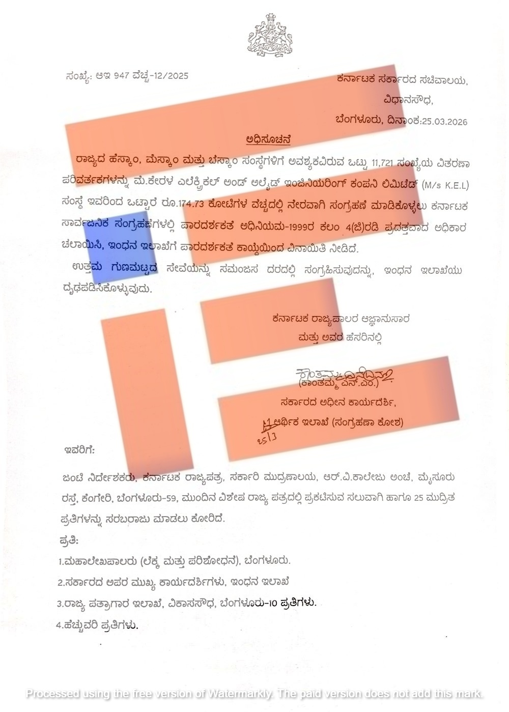 ಗುಲ್ಬರ್ಗ ವಿದ್ಯುತ್ ಸರಬರಾಜು ಕಂಪನಿ ವ್ಯಾಪ್ತಿಯಲ್ಲಿ 2025-26ನೇ ಸಾಲಿನಲ್ಲಿ ಅವಶ್ಯಕವಿರುವ 2,000 ವಿದ್ಯುತ್ ಪರಿವರ್ತಕಗಳನ್ನು 32.16 ಕೋಟಿ ರು ವೆಚ್ಚದಲ್ಲಿ ಕೇರಳ ಎಲೆಕ್ಟ್ರಿಕಲ್‌ ಅಲೈಡ್‌ ಇಂಜಿನಿಯರಿಂಗ್‌ ಕಂಪನಿಯಿಂದ ನೇರವಾಗಿ ಖರೀದಿಸಲು  2025ರ ಸೆಪ್ಟಂಬರ್ 2ರಂದು 4 ಜಿ ವಿನಾಯಿತಿ ನೀಡಿತ್ತು.