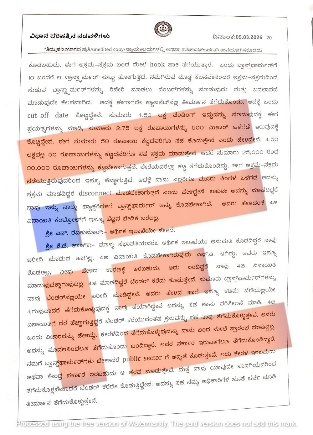 ಅಲ್ಲದೇ  ಅಧಿವೇಶನವು  ನಡೆಯುತ್ತಿದ್ದ ಹೊತ್ತಿನಲ್ಲಿಯೇ ಆರ್ಥಿಕ ಇಲಾಖೆಯು 2026ರ ಮಾರ್ಚ್‌ 25ರಂದೇ ಕೇರಳ ಎಲೆಕ್ಟ್ರಿಕಲ್ ಅಂಡ್‌ ಅಲೈಡ್‌ ಇಂಜಿನಿಯರಿಂಗ್‌ ಕಂಪನಿ ಲಿಮಿಟೆಡ್‌ಗೆ 4 ಜಿ ವಿನಾಯಿತಿ ನೀಡಿ ಅಧಿಸೂಚನೆ ಹೊರಡಿಸಿದೆ. ವಿಶೇಷವೆಂದರೇ  ಕೇರಳ ಎಲೆಕ್ಟ್ರಿಕಲ್ ಅಂಡ್‌ ಅಲೈಡ್‌ ಇಂಜಿನಿಯರಿಂಗ್‌ ಕಂಪನಿ ಲಿಮಿಟೆಡ್‌ಗೆ 4 ಜಿ ವಿನಾಯಿತಿ ನೀಡಲು ಆರ್ಥಿಕ ಇಲಾಖೆಯು ಬಲವಾಗಿ ಆಕ್ಷೇಪ ಎತ್ತಿತ್ತು. 174.73 ಕೋಟಿ ರುಪಾಯಿ ಮೊತ್ತದಲ್ಲಿ ಕರ್ನಾಟಕ ವಿದ್ಯುತ್ ಕಾರ್ಖಾನೆಯಿಂದಲೇ ಏಕೆ ಖರೀದಿಸಬಾರದು ಎಂದು ಇಂಧನ ಇಲಾಖೆಯನ್ನು ಕೇಳಿತ್ತು. ಆದರೀಗ ಆರ್ಥಿಕ ಇಲಾಖೆಯು ಕೇರಳ ಎಲೆಕ್ಟ್ರಿಕಲ್ ಅಂಡ್‌ ಅಲೈಡ್‌ ಇಂಜಿನಿಯರಿಂಗ್‌ ಕಂಪನಿ ಲಿಮಿಟೆಡ್‌ಗೆ 4 ಜಿ ವಿನಾಯಿತಿ ನೀಡಿ ಅಧಿಸೂಚನೆ ಹೊರಡಿಸಿರುವುದು ಚರ್ಚೆಗೆ ಗ್ರಾಸವಾಗಿದೆ.