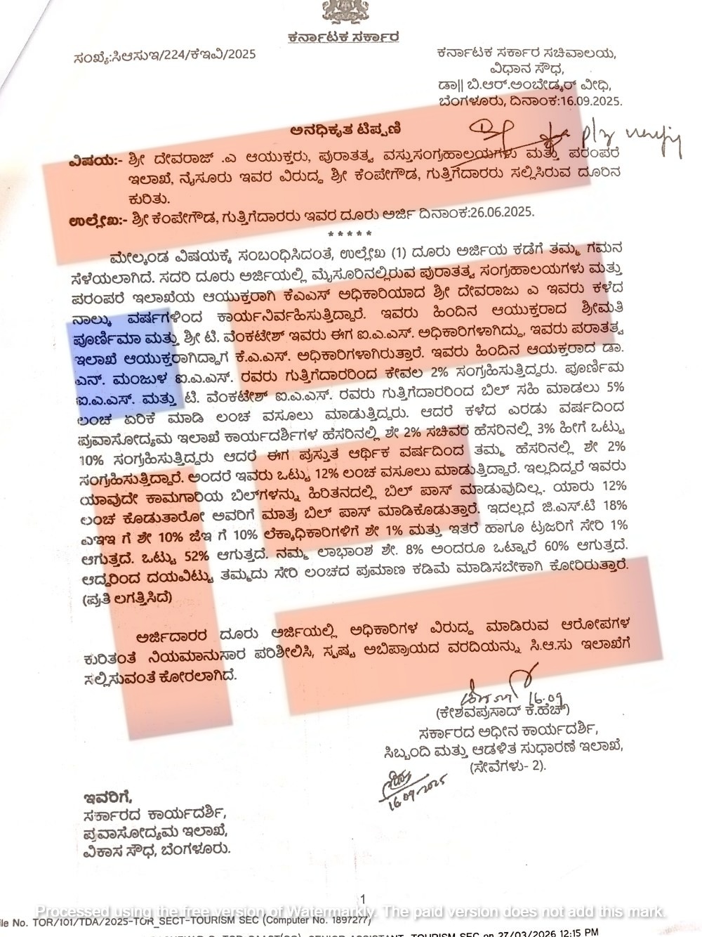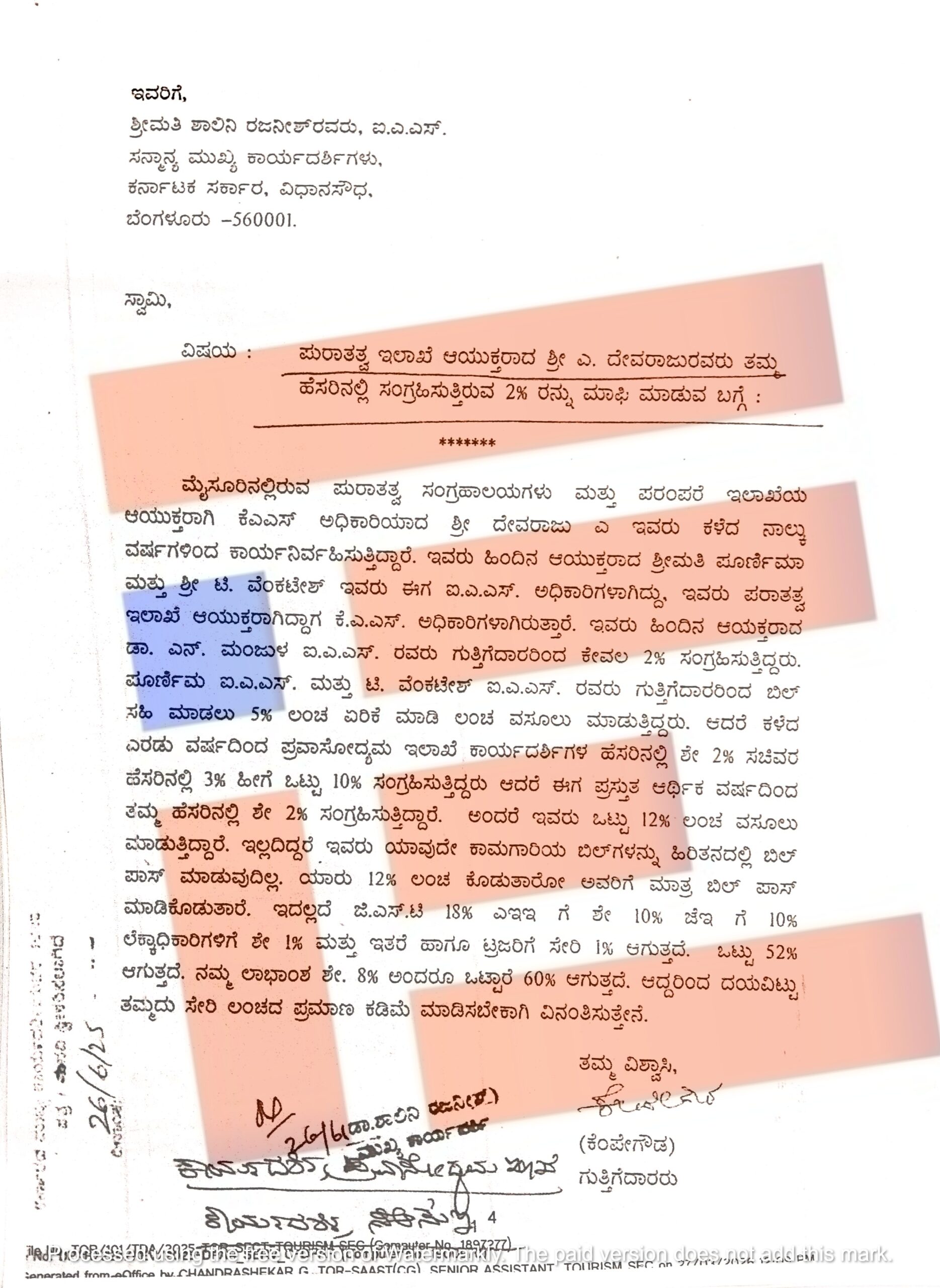 ಪ್ರವಾಸೋದ್ಯಮ ಇಲಾಖೆಯ ಸರ್ಕಾರದ ಕಾರ್ಯದರ್ಶಿ ಮತ್ತು ಪ್ರವಾಸೋದ್ಯಮ ಸಚಿವ ಹೆಚ್ ಕೆ ಪಾಟೀಲ್ ಹೆಸರಿನಲ್ಲಿ ವಸೂಲು ಮಾಡುತ್ತಿರುವ ಲಂಚದ ಪ್ರಮಾಣವನ್ನು ಕಡಿಮೆ ಮಾಡಿಸಬೇಕು ಎಂದು ಗುತ್ತಿಗೆದಾರರು ರಾಜ್ಯ ಸರ್ಕಾರದ ಮುಖ್ಯ ಕಾರ್ಯದರ್ಶಿಯನ್ನು ಅಲವತ್ತುಕೊಂಡಿದ್ದಾರೆ.