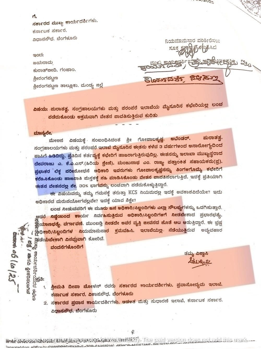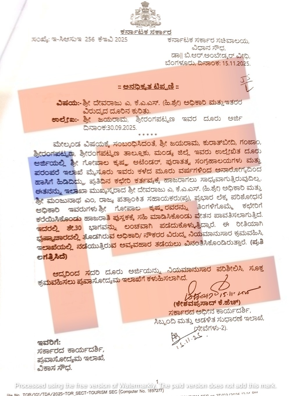 ಹಾಗೆಯೇ ಇಲಾಖೆಯ ಆಯುಕ್ತ ದೇವರಾಜು ಎ ಅವರ ಲಂಚಗುಳಿತನ ಬಗ್ಗೆ ಶ್ರೀರಂಗಪಟ್ಟಣದ ಜಯರಾಮ ಎಂಬುವರೂ 2025ರ ನವೆಂಬರ್ 15ರಂದು ಸರ್ಕಾರಕ್ಕೆ ದೂರು ಸಲ್ಲಿಸಿದ್ದರು.