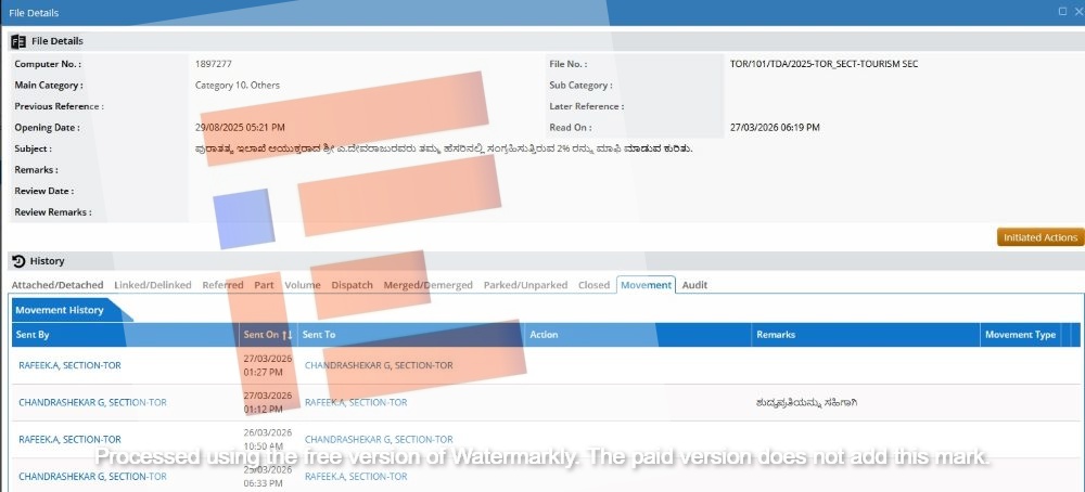 ಸದ್ಯ ಈ ಕಡತವು 2026ರ ಮಾರ್ಚ್ 27ರಿಂದಲೂ ಪ್ರವಾಸೋದ್ಯಮ ಇಲಾಖೆಯ ಶಾಖಾಧಿಕಾರಿ ಚಂದ್ರಶೇಖರ್ ಅವರ ಲಾಗಿನ್ನಲ್ಲಿರುವುದು ಗೊತ್ತಾಗಿದೆ.