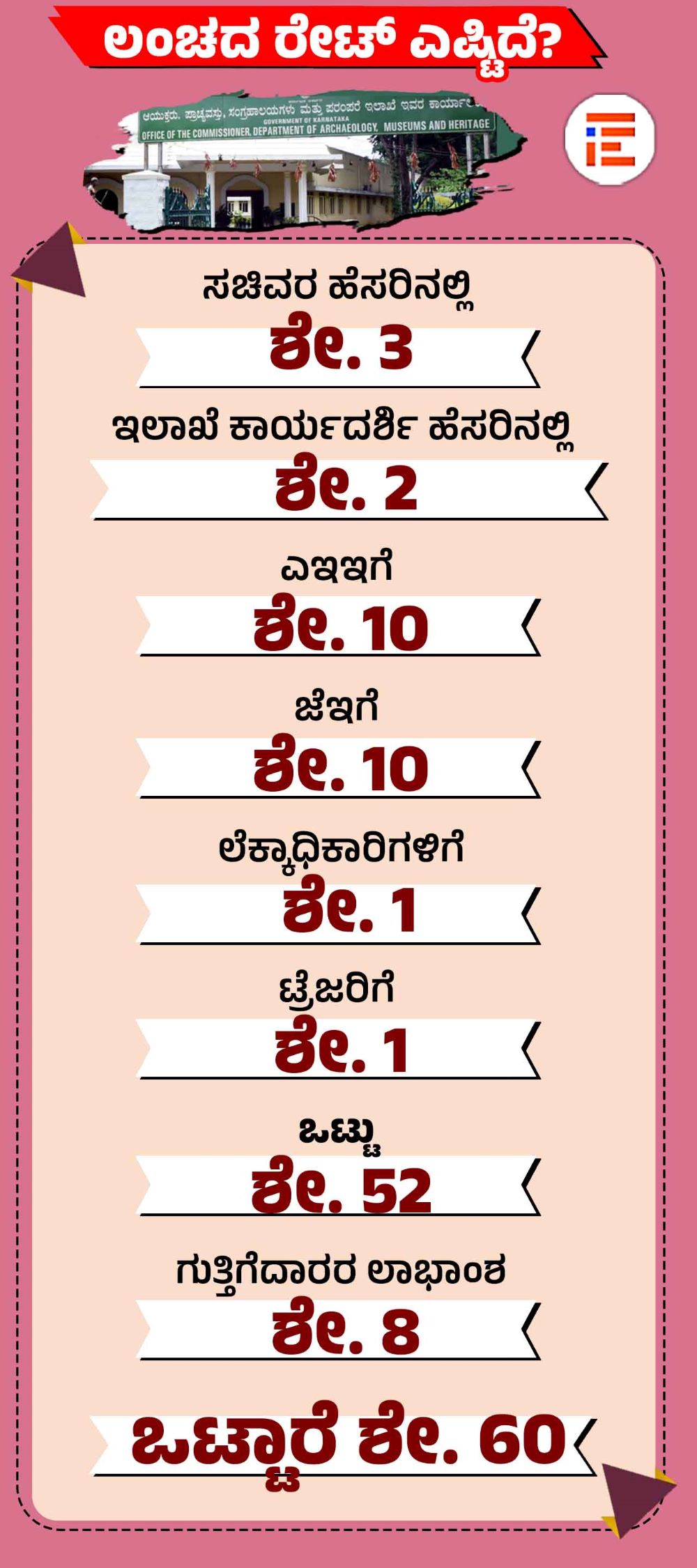 ಮೈಸೂರಿನಲ್ಲಿರುವ ಪುರಾತತ್ವ ಸಂಗ್ರಹಾಲಯಗಳು ಮತ್ತು ಪರಂಪರೆ ಇಲಾಖೆಯ ಆಯುಕ್ತರಾಗಿ ಕೆಎಎಸ್ ಅಧಿಕಾರಿ ದೇವರಾಜು ಎ ಅವರು ಕಳೆದ ನಾಲ್ಕು ವರ್ಷಗಳಿಂದಲೂ ಕಾರ್ಯನಿರ್ವಹಿಸುತ್ತಿದ್ದಾರೆ. ಈ ಮೊದಲು ಪುರಾತತ್ವ ಸಂಗ್ರಹಾಲಯಗಳು ಮತ್ತು ಪರಂಪರೆ ಇಲಾಖೆಯಲ್ಲಿ ಆಯುಕ್ತರಾಗಿ ಕಾರ್ಯನಿರ್ವಹಿಸಿದ್ದ ಪೂರ್ಣಿಮಾ ಮತ್ತು ಟಿ ವೆಂಕಟೇಶ್ ಅವರು ಈಗ ಐಎಎಸ್ ಅಧಿಕಾರಿಗಳಾಗಿದ್ದಾರೆ. ಇವರಿಗಿಂತಲೂ ಮೊದಲು ಇಲಾಖೆಯ ಹಿಂದಿನ ಆಯುಕ್ತರಾಗಿದ್ದ ಐಎಎಸ್ ಅಧಿಕಾರಿ ಡಾ ಎನ್ ಮಂಜುಳ ಅವರು ಗುತ್ತಿಗೆದಾರರಿಂದ ಕೇವಲ 2 ಪರ್ಸೆಂಟ್ ಸಂಗ್ರಹಿಸುತ್ತಿದ್ದರು ಎಂದು ವಿವರಿಸಿರುವುದು ದೂರಿನಿಂದ ಗೊತ್ತಾಗಿದೆ.