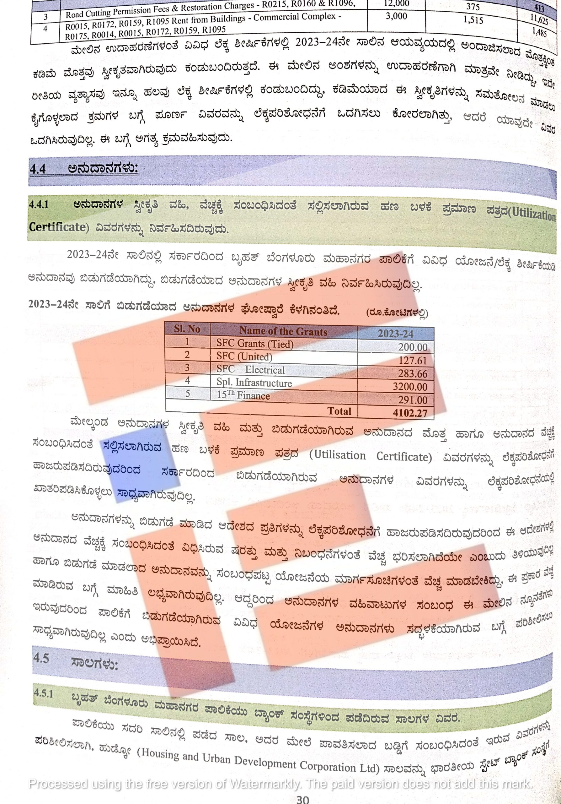 ಬಿಬಿಎಂಪಿಯು 2023-24ನೇ ಸಾಲಿನಲ್ಲಿ ವಿವಿಧ ಬ್ಯಾಂಕ್ಗಳು ಮತ್ತು ಹಣಕಾಸು ಸಂಸ್ಥೆಗಳಿಂದ ಪಡೆದಿರುವ ಸಾಲಗಳ ವಿವರಗಳ ಕುರಿತು ಲೆಕ್ಕ ಪರಿಶೋಧನೆಯಲ್ಲಿ ಹಲವು ನ್ಯೂನತೆಗಳು ಪತ್ತೆಯಾಗಿವೆ. ಹುಡ್ಕೋದಿಂಧ ಪಡೆದಿದ್ದ ಸಾಲವನ್ನು ಭಾರತೀಯ ಸ್ಟೇಟ್ ಬ್ಯಾಂಕ್ ಸಂಸ್ಥೆಗೆ ಹಸ್ತಾಂತರಿಸಿfದ ಸಾಲವನ್ನು, ಸ್ವತ್ತುಗಳನ್ನು ಜೊತೆಗೆ ಹಡ್ಸನ್ ಶಾಖೆಯಲ್ಲಿರುವ ಎಸ್ಬಿಐನ ಶಾಖೆಯಲ್ಲಿ ಸಾಲಕ್ಕೆ ಭದ್ರತೆಯಾಗಿ ನೀಡಿದ್ 40 ಕೋಟಿ ರು ಠೇವಣಿಯನ್ನು ಹಿಂಪಡೆದಿತ್ತು. ಅದರೊಂದಿಗೆ ಸ್ವಂತ ಸಂಪನ್ಮೂಲದ ನಿಧಿಯಿಂದ ಸಾಲದ ಮೊತ್ತವನ್ನು ಪೂರ್ಣವಾಗಿ ಪಾವತಿಸಿತ್ತು.