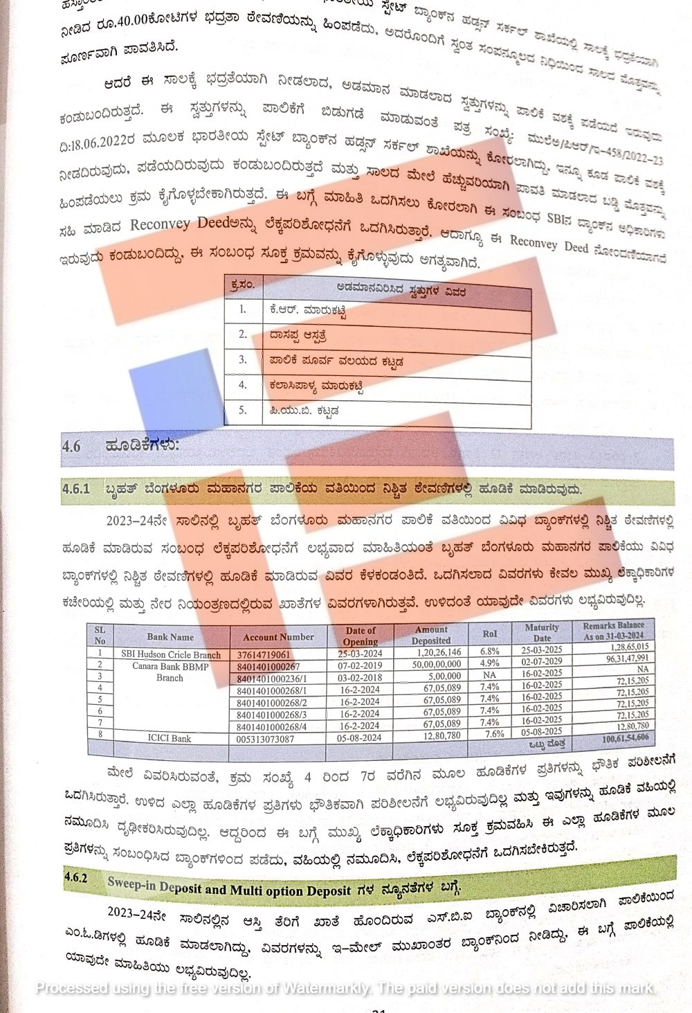 ಆದರೆ ಈ ಸಾಲಕ್ಕೆ ಭದ್ರತೆಯಾಗಿ ಕೆ ಆರ್ ಮಾರುಕಟ್ಟೆ, ದಾಸಪ್ಪ ಆಸ್ಪತ್ರೆ, ಪಾಲಿಕೆ ಪೂರ್ವ ವಲಯದ ಆಸ್ಪತ್ರೆ, ಕಲಾಸಿಪಾಳ್ಯ ಮಾರುಕಟ್ಟೆ, ಪಿಯುಬಿ ಕಟ್ಟಡಗಳನ್ನು ಅಡಮಾನವಿರಿಸಿತ್ತು. ಅಡಮಾನ ಮಾಡಿದ್ದ ಈ ಸ್ವತ್ತುಗಳನ್ನು ಪಾಲಿಕೆ ವಶಕ್ಕೆ ಪಡೆದಿರಲಿಲ್ಲ. ಈ ಸ್ವತ್ತುಗಳನ್ನು ಪಾಲಿಕೆಗೆ ಬಿಡುಗಡೆ ಮಾಡಬೇಕು ಎಂದು 2022ರ ಜೂನ್ 18ರಂದೇ ಎಸ್ಬಿಐ ಶಾಖೆಯನ್ನು ಕೋರಿತ್ತು ಇನ್ನೂ ಕೂಡ ಪಾಲಿಕೆ ವಶಕ್ಕೆ ನೀಡದಿರುವುದು ಮತ್ತು ಪಡೆಯದಿರುವುದು ಕಂಡು ಬಂದಿದೆ. ಅಲ್ಲದೇ ಈ ಸಾಲದ ಮೇಲೆ ಹೆಚ್ಚುವರಿಯಾಗಿ ಪಾವತಿ ಮಾಡಿದ್ದ ಬಡ್ಡಿ ಮೊತ್ತವನ್ನೂ ಹಿಂಪಡೆಯಲು ಕ್ರಮ ವಹಿಸಿಲ್ಲ ಎಂದು ಲೆಕ್ಕ ಪರಿಶೋಧನೆ ವರದಿಯಲ್ಲಿ ವಿವರಿಸಿದೆ.