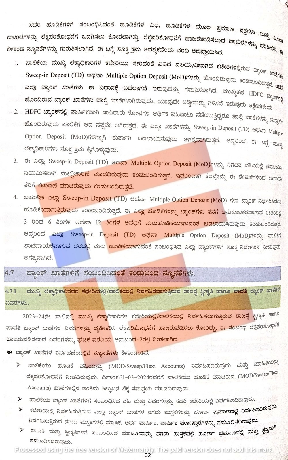 ಸ್ವೀಪ್ ಇನ್ ಡಿಪಾಸಿಟ್ ಅಥವಾ ಎಂಒಡಿಗಳನ್ನು ನಿಗದಿತ ವಹಿಯಲ್ಲಿ ನಮೂದಿಸಿ ನಿಯಮಿತವಾಗಿ ಮೇಲ್ವಿಚಾರಣೆ ಮಾಡಿಲ್ಲ. ಇದರಿಂದಾಗಿ ಕೆಲವೊಮ್ಮೆ ಈ ಠೇವಣಿಗಳಿಂದ ಆದಾಯ ತೆರಿಗೆ ಕಟಾವಣೆ ಮಾಡಿರುವುದು ಕಂಡು ಬಂದಿದೆ. ಬಹುತೇಕ ಎಲ್ಲಾ ಸ್ವೀಪ್ ಇನ್ ಡಿಪಾಸಿಟ್ ಅಥವಾ ಎಂಒಡಿಗಳು ಬ್ಯಾಂಕ್ ನಿರ್ಧರಿಸಿದಂತೆ ಹೂಡಿಕೆಯಾಗುತ್ತಿದೆ. ಈ ಎಲ್ಲಾ ಹೂಡಿಕೆಗಳನ್ನು ತನಗೆ ಅನುಕೂಲಕರವಾಗುವ ರೀತಿಯಲ್ಲಿ 3ರಿಂದ 6 ತಿಂಗಳು ಅಥವಾ 12 ತಿಂಗಳ ಅವಧಿಗೆ ಮರುಹೂಡಿಕೆಯಾಗುವಂತೆ ಬದಲಾಯಿಸಿದೆ.