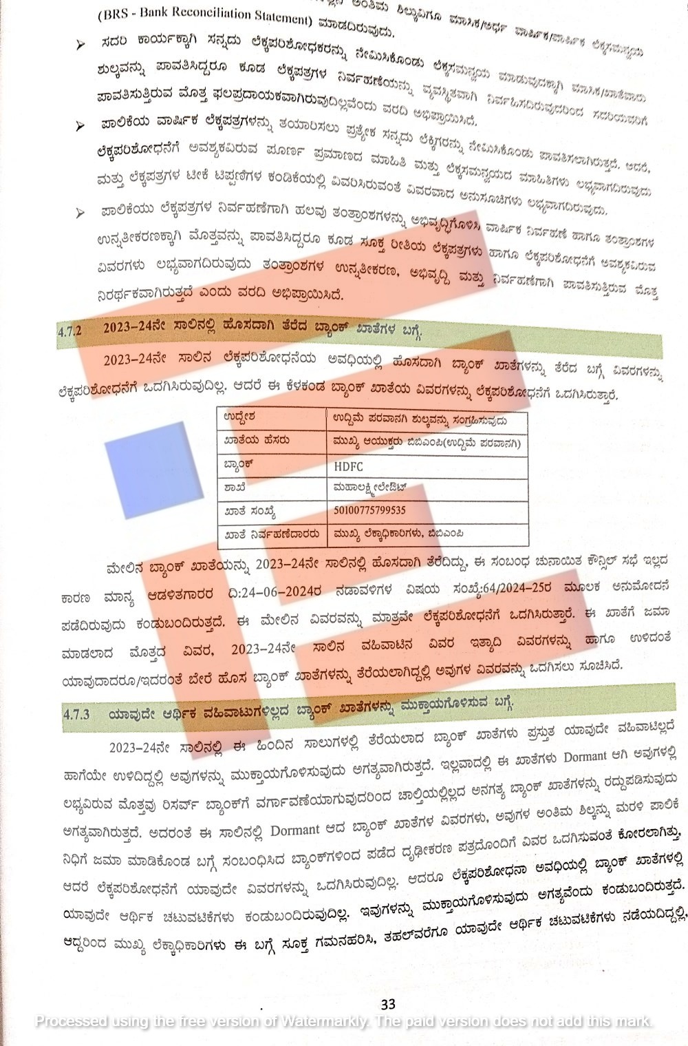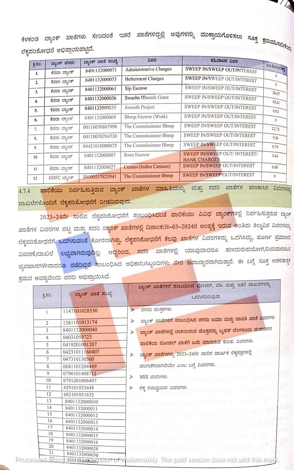 2023-24ನೇ ಸಾಲಿನಲ್ಲಿ ಪಾಲಿಕೆಯು ಹೊಂದಿದ್ದ 12 ಖಾತೆಗಳಿಗೆ ಸಂಬಂಧಿಸಿದಂತೆ ನಗದು ಪುಸ್ತಕ, ಬ್ಯಾಂಕ್ ಖಾತೆಗಳಿಗೆ ಸಂಬಂಧಿಸಿದ ನಗದು ಜಮಾ ಮತ್ತು ಪಾವತಿ ಖಾತೆ ವಿವರಗಳು, ಬ್ಯಾಂಕ್ ಖಾತೆಗಳಲ್ಲಿ ಬಾಕಿಯಿರುವ ಮೊತ್ತವನ್ನು ಬೃಹತ್ ಬೆಂಗಳೂರು ಮಹಾನಗರಪಾಲಿಕೆಯ ನೋಡಲ್ ಖಾತೆಗೆ ಜಮಾ ಮಾಡಿರುವ ವಿವರಗಳು, ಬ್ಯಾಂಕ್ ಖಾತೆಗಳನ್ನು 2023-24ನೇ ಸಾಲಿಗೆ ವಾರ್ಷಿಕ ಲೆಕ್ಕಪತ್ರಗಳಲ್ಲಿ ಪರಿಗಣಿಸಲಾಗಿದೆಯೇ ಎಂಬ ವಿವರಗಳೂ, ಎಂಐಎಸ್ ವರದಿ ಮತ್ತ ಲೆಕ್ಕ ಸಮನ್ವಯದ ವಿವರಗಳನ್ನು ಲೆಕ್ಕ ಪರಿಶೋಧಕರಿಗೆ ಒದಗಿಸಿಲ್ಲ.