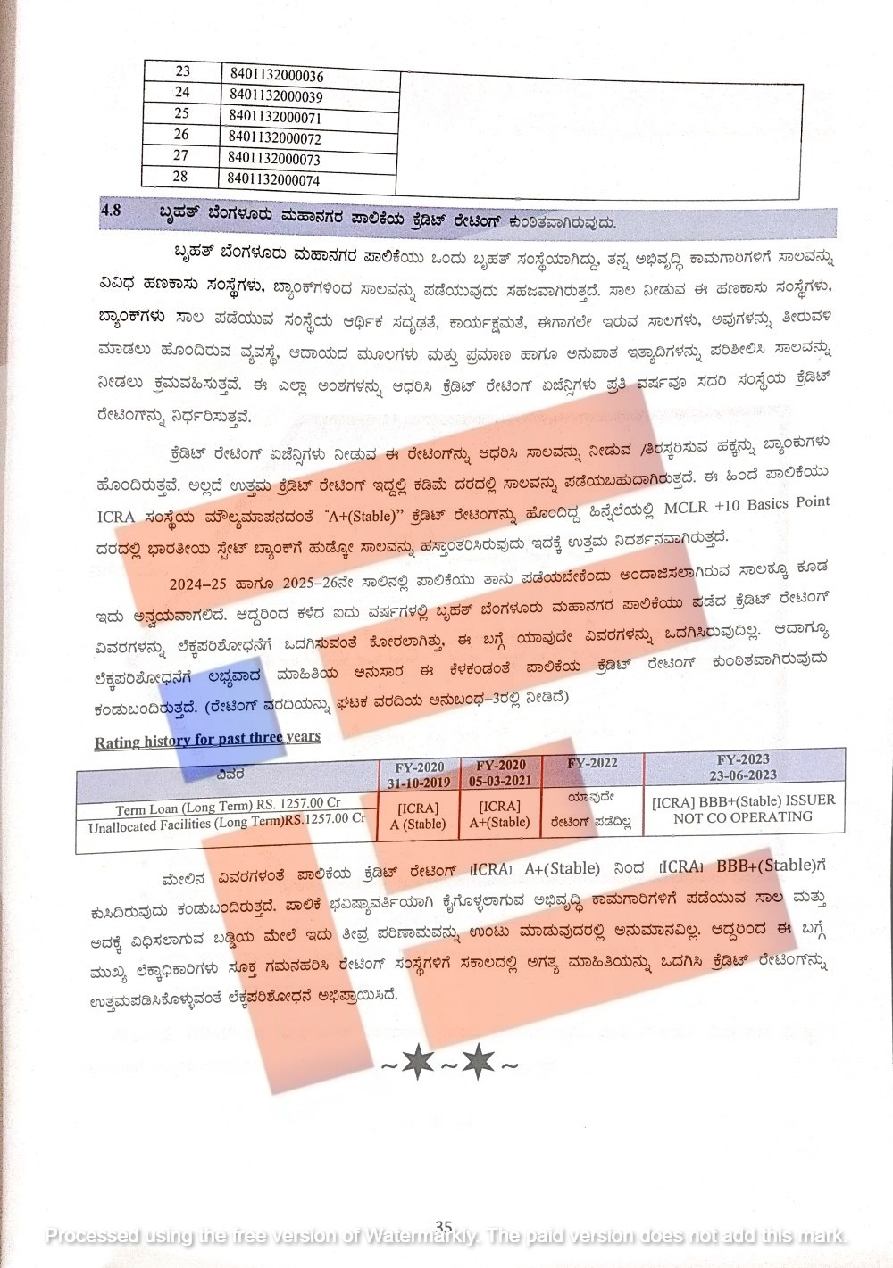 2024-25 ಮತ್ತು 2025-26ನೇ ಸಾಲಿನಲ್ಲಿ ಪಾಲಿಕೆಯು ತಾನು ಪಡೆಯಬೇಕೆಂದು ಅಂದಾಜಿಸಿರುವ ಸಾಲಕ್ಕೂ ಕೂಡ ಇದು ಅನ್ವಯವಾಗಲಿದೆ. ಹೀಗಾಗಿ ಇದರ ಎಲ್ಲಾ ವಿವರಗಳನ್ನು ಲೆಕ್ಕ ಪರಿಶೋಧಕರು ಕೋರಿದ್ದರು. ಆದರೆ ಈ ಬಗ್ಗೆ ಪಾಲಿಕೆಯು ಯಾವುದೇ ವಿವರಗಳನ್ನೂ ಲೆಕ್ಕ ಪರಿಶೋಧಕರಿಗೆ ಒದಗಿಸಿಲ್ಲ. ಲೆಕ್ಕ ಪರಿಶೋಧನೆಗೆ ಲಭ್ಯವಿದ್ದ ಮಾಹಿತಿ ಪ್ರಕಾರ ಪಾಲಿಕೆಯ ಕ್ರೆಡಿಟ್ ರೇಟಿಂಗ್ ಕುಸಿದಿದೆ. ಭವಿಷ್ಯದಲ್ಲಿ ಕೈಗೊಳ್ಳುವ ಅಭಿವೃದ್ಧಿ ಕಾಮಗಾರಿಗಳಿಗೆ ಪಡೆಯುವ ಸಾಲ ಮತ್ತು ಅದಕ್ಕೆ ವಿಧಿಸಲಾಗುವ ಬಡ್ಡಿ ಮೇಲೆ ಇದು ತೀವ್ರ ಪರಿಣಾಮ ಉಂಟು ಮಾಡುವುದರಲ್ಲಿ ಯಾವುದೇ ಅನುಮಾನಗಳಿಲ್ಲ ಎಂದು ಲೆಕ್ಕ ಪರಿಶೋಧಕರು ವಿವರಿಸಿದ್ದಾರೆ.