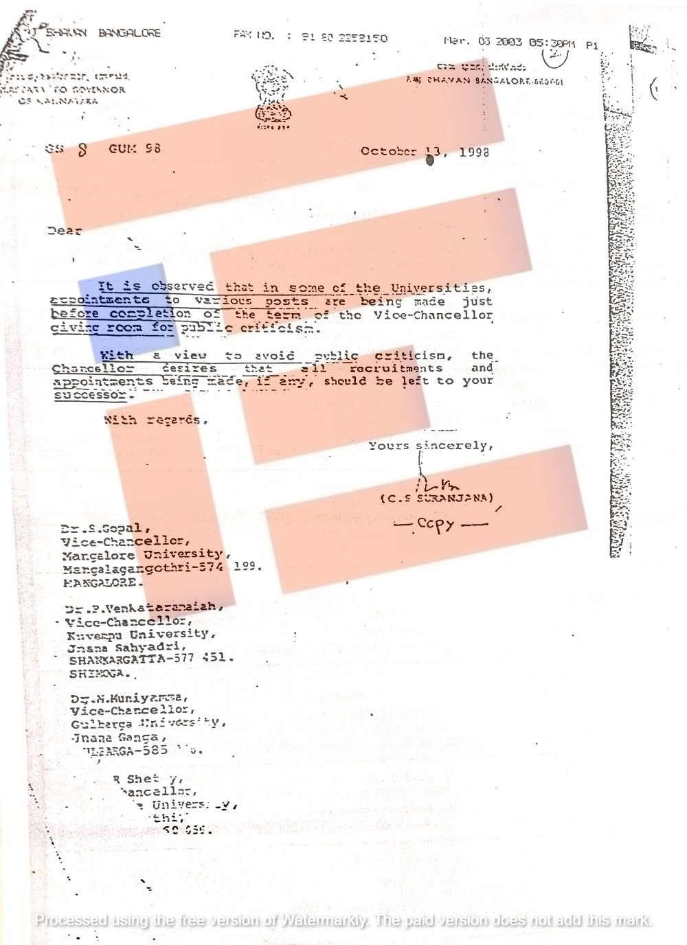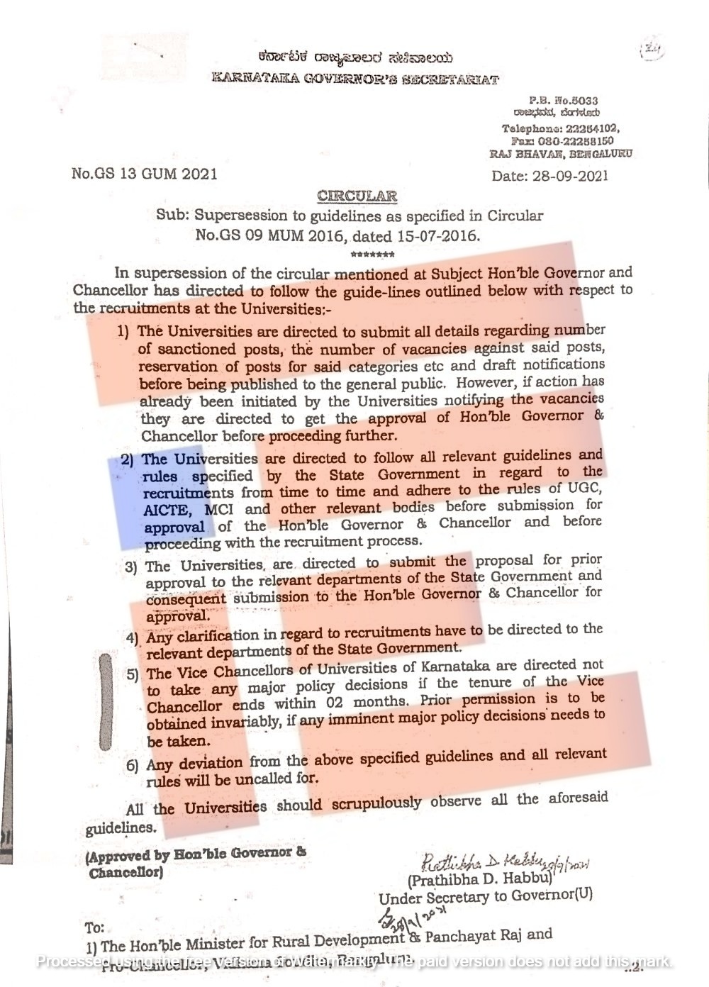 ವಿಶ್ವವಿದ್ಯಾನಿಲಯಗಳ ಕುಲಪತಿಗಳು ತಮ್ಮ ಅಧಿಕಾರವದಿಯ ಕೊನೆ 6 ತಿಂಗಳು ನೇಮಕಾತಿಗಳನ್ನೂ ಒಳಗೊಂಡಂತೆ ಯಾವುದೇ ರೀತಿಯ ಪ್ರಮುಖ ಆರ್ಥಿಕ ಹಾಗೂ ಆಡಳಿತಾತ್ಮಕ ತೀರ್ಮಾನಗಳನ್ನು ತೀರ್ಮಾನಗಳನ್ನು ತೆಗೆದುಕೊಳ್ಳತಕ್ಕದ್ದಲ್ಲ ಎಂದು ರಾಜ್ಯದ ವಿಶ್ವವಿದ್ಯಾನಿಲಯಗಳ ಕುಲಾಧಿಪತಿಗಳೂ ಆಗಿರುವ ರಾಜ್ಯಪಾಲರು ಹೊರಡಿಸಿದ್ದ ಆದೇಶವು 1998ರಿಂದಲೂ ಚಾಲ್ತಿಯಲ್ಲಿದೆ.