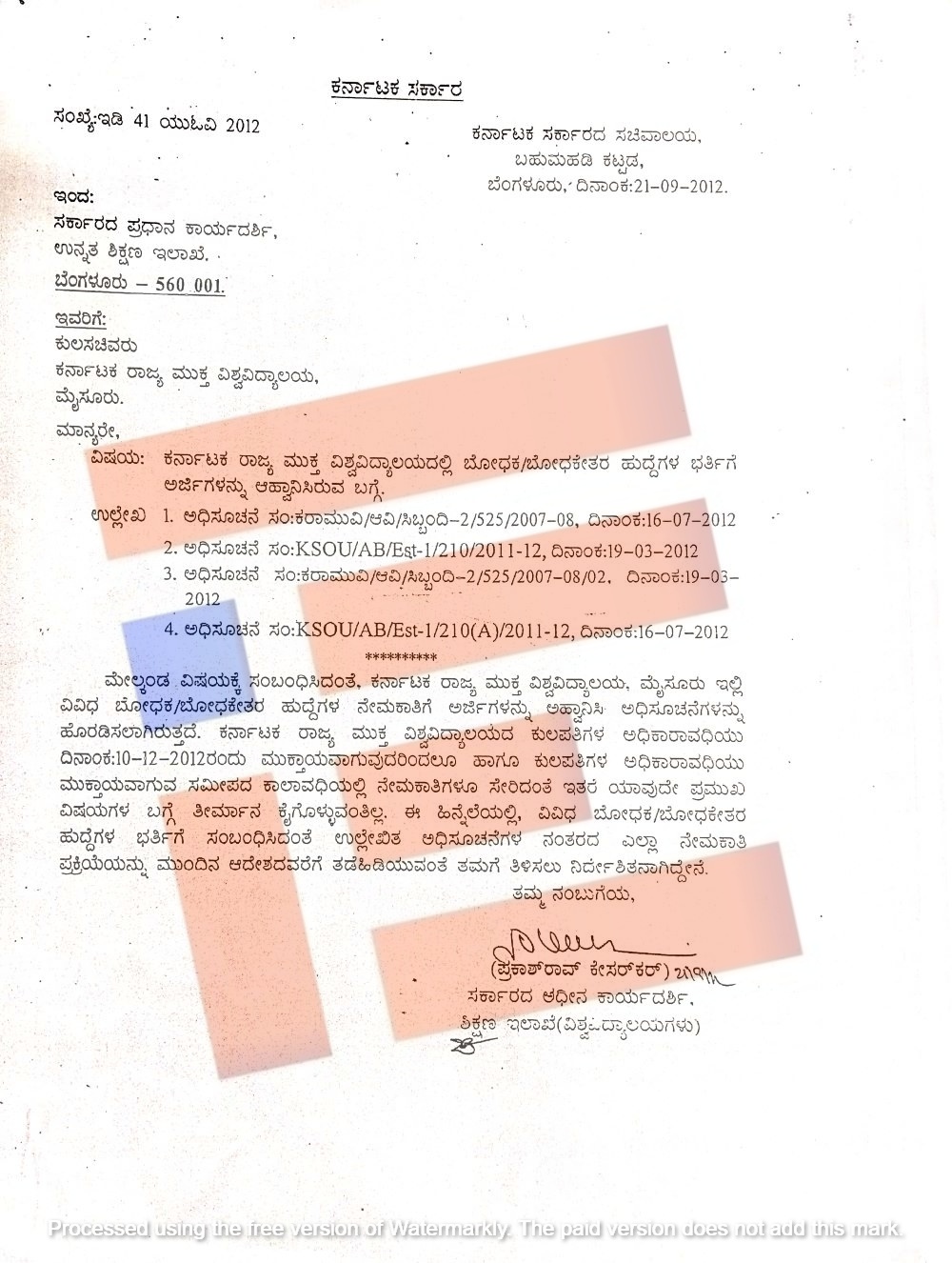 ‘ಕರ್ನಾಟಕ ರಾಜ್ಯ ಮುಕ್ತ ವಿಶ್ವವಿದ್ಯಾಲಯದಲ್ಲಿ ವಿವಿಧ ಬೋಧಕ, ಬೋಧಕೇತರ ಹುದ್ದೆಗಳ ನೇಮಕಾತಿಗೆ ಅರ್ಜಿಗಳನ್ನು ಆಹ್ವಾನಿಸಿ ಅಧಿಸೂಚನೆ ಹೊರಡಿಸಲಾಗಿದೆ. ಕರ್ನಾಟಕ ರಾಜ್ಯ ಮುಕ್ತ ವಿಶ್ವವಿದ್ಯಾಲಯದ ಕುಲಪತಿಗಳ ಅಧಿಕಾರಾವಧಿಯು 2012ರ ಡಿಸೆಂಬರ್ 10ರಂದು ಮುಕ್ರಾಯವಾಗಲಿದೆ. ಕುಲಪತಿಗಳ ಅಧಿಕಾರಾವಧಿಯು ಮುಕ್ತಾಯವಾಗುವ ಸಮೀಪದ ಕಾಲಾವಧಿಯಲ್ಲಿ ನೇಮಕಾತಿಗಳೂ ಸೇರಿದಂತೆ ಇತರೆ ಯಾವುದೇ ಪ್ರಮುಖ ವಿಷಯಗಳ ಬಗ್ಗೆ ತೀರ್ಮಾನ ಕೈಗೊಳ್ಳುವಂತಿಲ್ಲ,’ ಎಂದು ಸ್ಪಷ್ಟವಾಗಿ ಸೂಚಿಸಿತ್ತು.